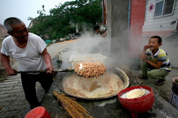每天漁家人將從渤海灣中回游出沒的小蝦打撈上來,在家門前的立灶爐上燒松樹枝子把一大鍋水燒的滾開倒進(jìn)蝦,然后用大罩漓撈出鍋,撒在較平坦的水泥地面上;太陽一曬,水泥地上溫度高,蝦很快曬爆皮,皮很脆,用簸箕扇去皮,蝦皮就脫落,一顆顆金鉤一樣的海米十分喜人地展現(xiàn)在眼前……