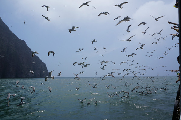 鳥島的海鷗,特別多,始終跟在我們船邊,大家都在用方便面喂它們。海鷗喜歡吃方便面,真是重口味哦~~