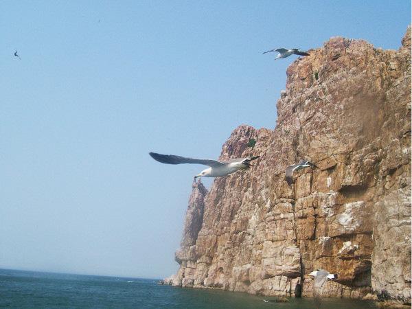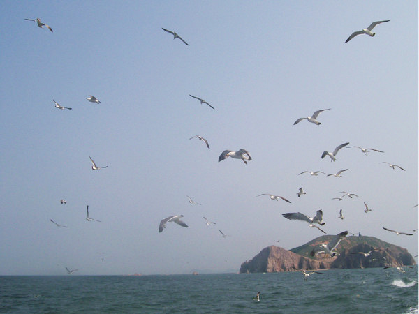 在船上搖搖晃晃的睡著了,船老大提醒到了鳥島,讓我們除了看海鷗。興奮的跑出去,果然大片大片的海鷗已經(jīng)跟在了船后,買了一包方便面10塊錢,散裝的4片裝。第一次三下五除二就被我全部扔光光,然后發(fā)現(xiàn)其實剛剛的大片海鷗只是冰山一角。待船再往前倒真正的鳥島時,海鷗多得像是一把方便面可以砸下一片鳥來。
