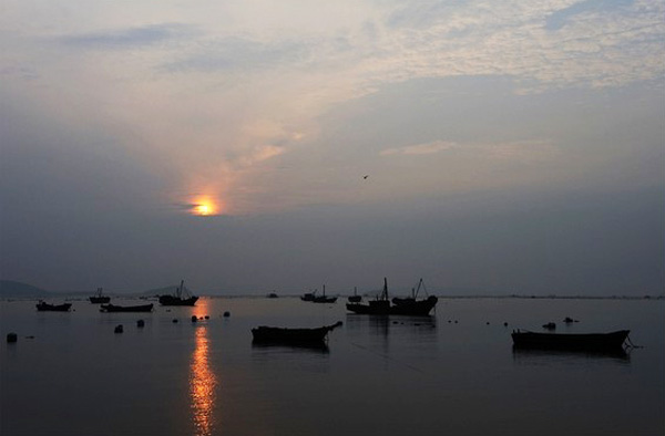 傍晚開車去吃晚飯,看到太陽落山,趕緊拍了張漁歌唱晚。