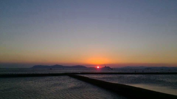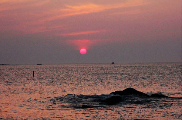 從月牙灣觀看落日,非常璀璨壯觀,令人影響深刻,尤其是當(dāng)有漁船返航,經(jīng)過落日余暉時,意境太美了!在月牙灣一直呆到日落,我們才意猶未盡的往回趕。選擇先去九丈崖再游半月灣還有一個原因是我們選擇的漁家就坐落在半月灣旁邊,步行五分鐘就回去了。
