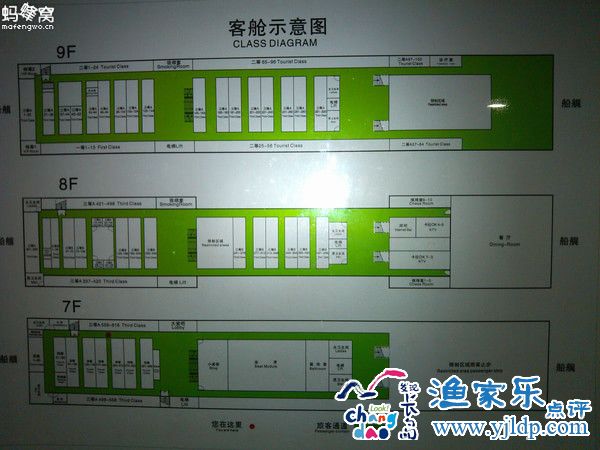 登船的時候,仰頭欣賞,大概有十層樓高,第一次乘坐這么大的船,真有“Titanic”的感覺。船的七層到九層是客房,我買的是四等艙,在七層,是八個人的房間,就像上學(xué)時候的宿舍一樣,上下鋪共四張床。船啟航后,帶著孩子到了九層的甲板上,看到了直升機的停機坪,孩子特別興奮,拍了很多照片。