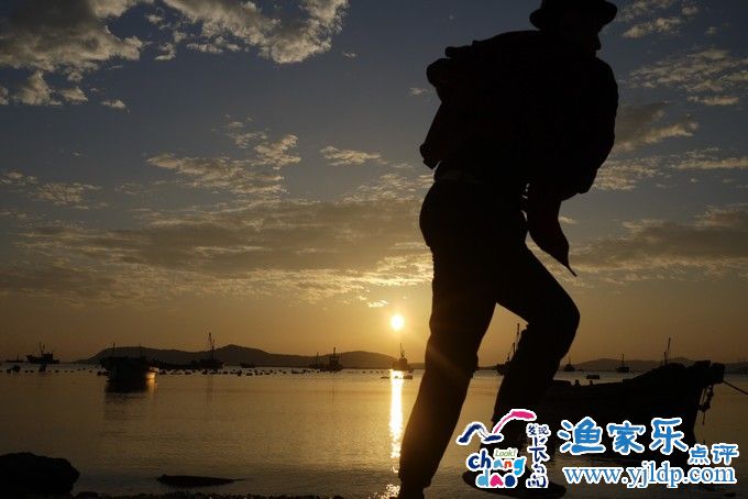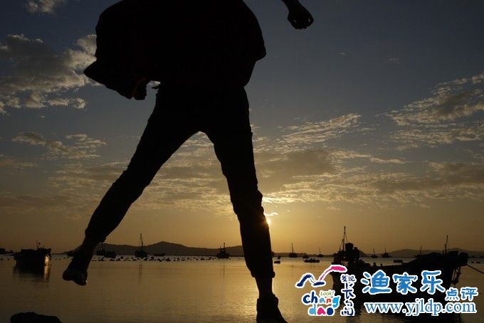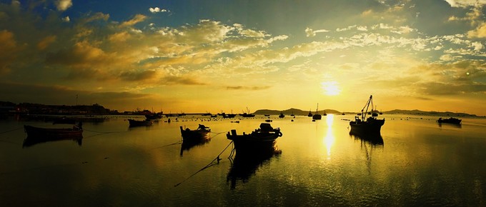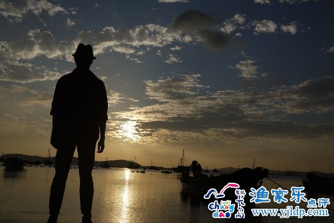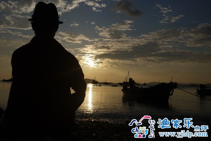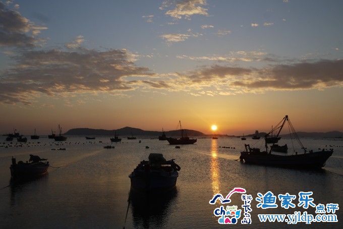落日的余暉灑在海面上,加上靜靜飄在海上漁船,這一幕如夢如畫。