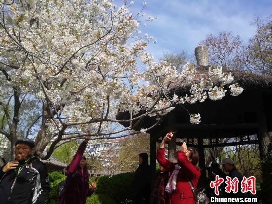 21日上午,五龍?zhí)毒皡^(qū)內(nèi)早櫻品種競(jìng)相開(kāi)放,已進(jìn)入最佳觀賞期。以名士聚集聞名遐邇的濟(jì)南五龍?zhí)豆沤ㄖ簤吺㈤_(kāi)??????ξ???的櫻花,顯得格外清新雅致,吸引眾多游客和市民慕名前來(lái)觀賞。游人或在櫻花樹(shù)前駐足觀賞,或帶著攝像機(jī)捕捉櫻花盛開(kāi)的靚麗景色。