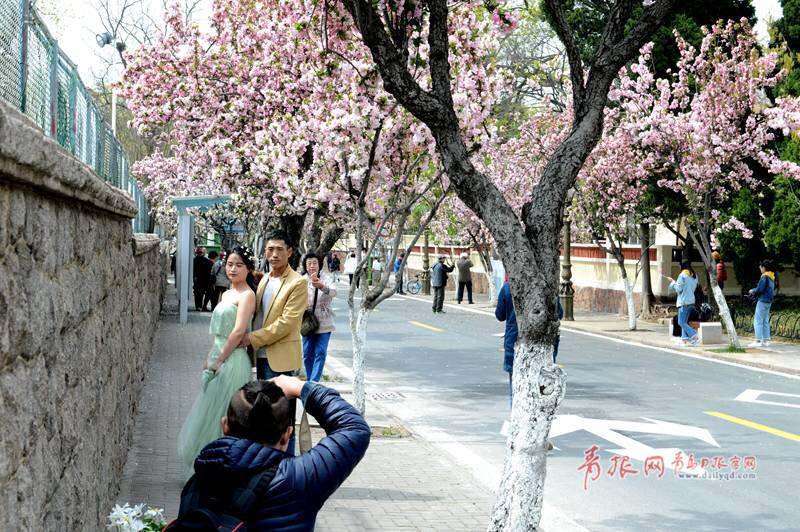 山東旅游景點大全 一對對新人在海棠花下留下永恒的倩影。