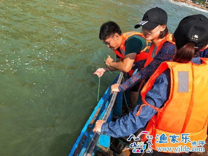 重頭戲來(lái)啦!10點(diǎn)半左右我們結(jié)束釣魚,跟隨當(dāng)?shù)氐臐O民出海,體驗(yàn)當(dāng)?shù)氐臐O民生活。坐的是當(dāng)?shù)氐臐O船,船體很搖晃,漁民一臉黝黑的很樸素,盯緊我們的安全,到了魚和螃蟹多的地方,他停下船,和我們講述他們平常捕撈魚的生活,我們也聽得很動(dòng)容,心里想著,他們一天到晚只是打漁,一定沒有煩惱吧?