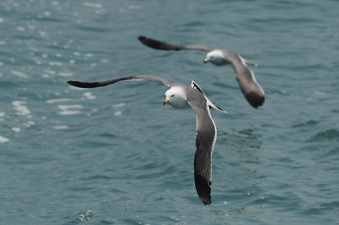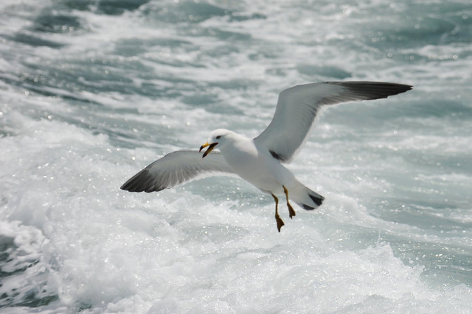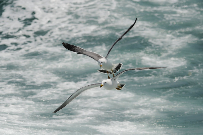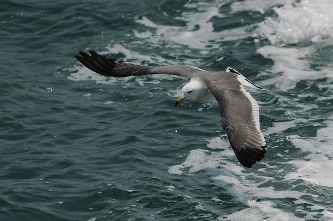 想是已經(jīng)靠近萬(wàn)鳥(niǎo)島,幾百只海鷗不知從哪里鉆了出來(lái),一路追著我們的游船,大家把準(zhǔn)備好的饅頭和掰碎的方便面扔向空中,這些靈巧的家伙們輕輕一個(gè)俯沖就叼走了??磥?lái)已經(jīng)是輕車熟路。