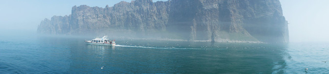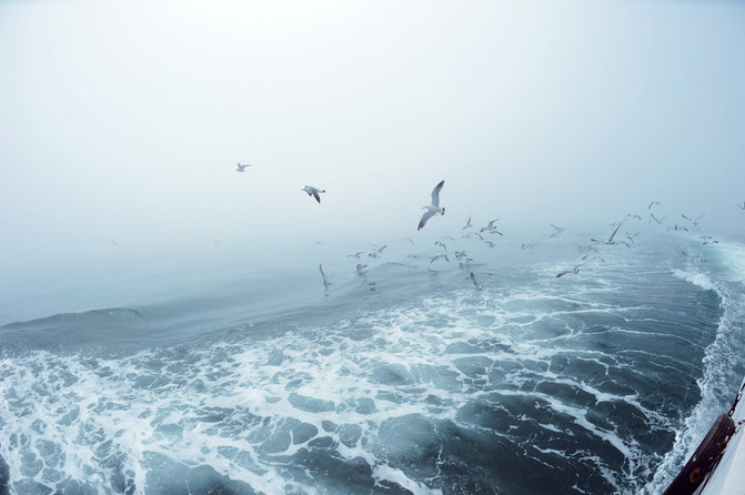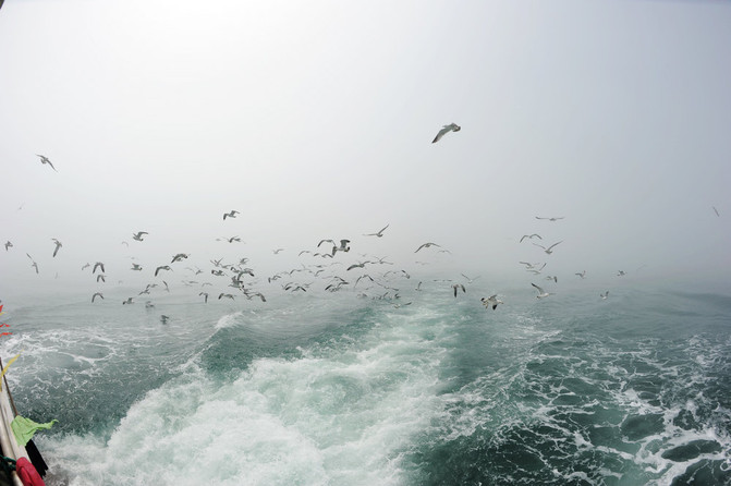 巧合一般,當(dāng)我們的船駛過(guò)萬(wàn)鳥(niǎo)島,霧氣又再次彌漫~四周皆是一片蒼?!B(niǎo)群們依然在后面追逐著,遲遲不肯散去。