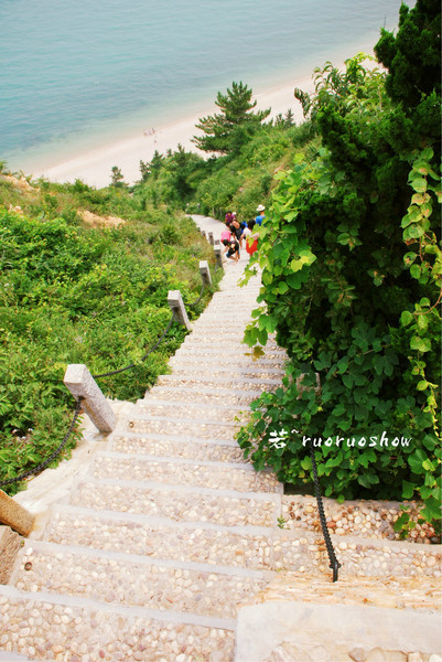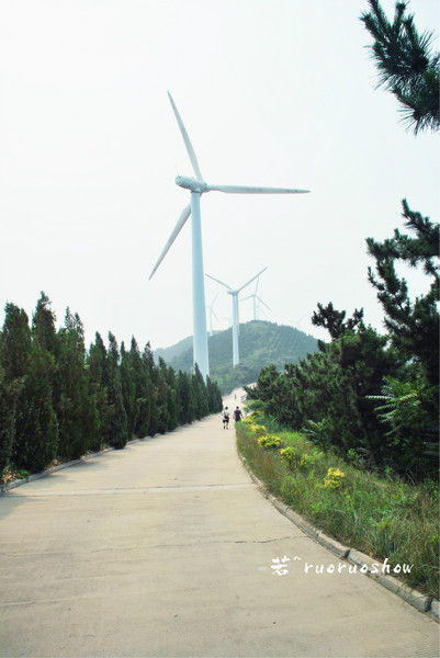 第三天的時(shí)光留給了“林海烽山”。烽山上到處都有長(zhǎng)島的標(biāo)志——風(fēng)車(chē),前兩天只是遠(yuǎn)眺,今天,可以近距離的瞧瞧這些富有童趣的大風(fēng)車(chē)了。站在風(fēng)車(chē)底下,抬頭看著轉(zhuǎn)動(dòng)的葉片,忽明忽暗的影子不停地變幻,不同的是,吹風(fēng)車(chē)的已不再是我們……但是,長(zhǎng)島上的風(fēng)車(chē)卻有著實(shí)際的作用,就是發(fā)電,每轉(zhuǎn)動(dòng)一圈能產(chǎn)生一元錢(qián)的電,環(huán)保。爬到山頂,我們沿著369級(jí)的石階一級(jí)一級(jí)地下,便又來(lái)到了海邊,再次看到大海,突然有種回歸的感受,心曠神怡。牟大叔說(shuō)“下了369級(jí)臺(tái)階,千萬(wàn)別原路返回,沿著海邊走,走到另一頭,也有能上山的路,出口就能看到黃渤海交界處”,于是,我們便沿著海慢慢走,走著走著,發(fā)現(xiàn)整個(gè)海灘只剩下我們四個(gè)人,時(shí)間也好像靜止一般。上山的路有臺(tái)階也有坡路,一番辛苦,終于到達(dá)山頂,黃渤海的交界處可以直接看到,如果想看得更加清晰,也可以租個(gè)高倍望遠(yuǎn)鏡(費(fèi)用:3元)。