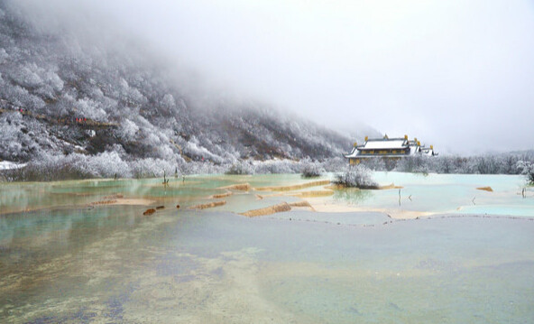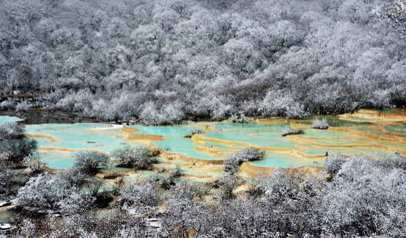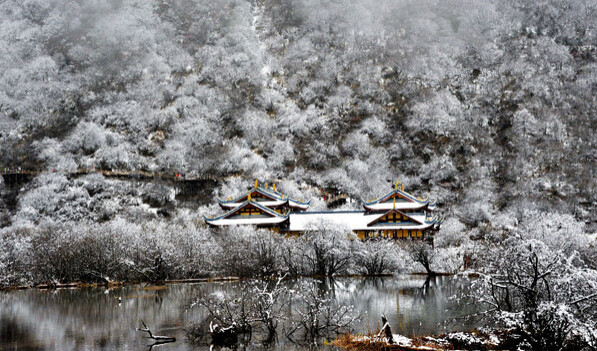 九寨溝之冬:山巒與樹林銀裝素裹,瀑布與湖泊冰清玉潔,九寨溝變得雪白而又寧靜,藍(lán)色湖面的冰層在日出日落的溫差中,變幻著奇妙的冰紋,冰凝的瀑布間、細(xì)細(xì)的水流發(fā)出沁人心脾的樂音。