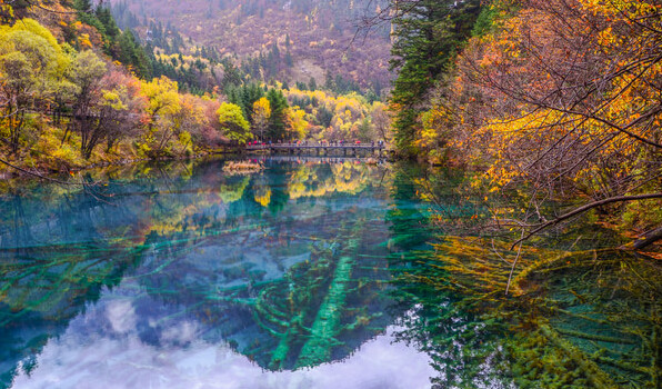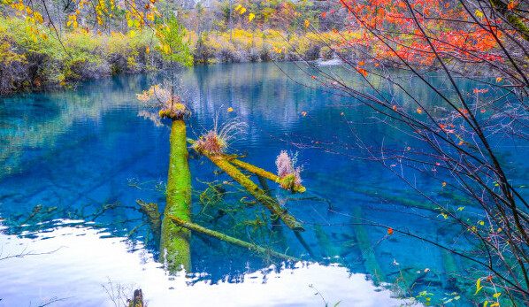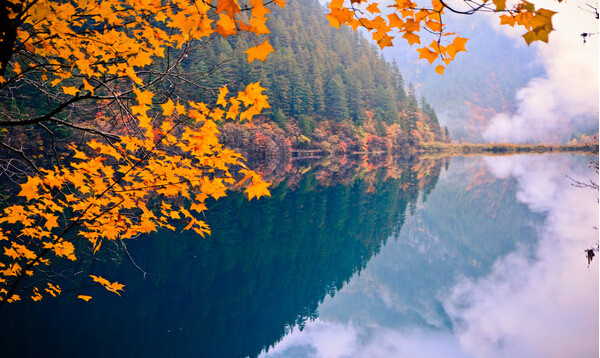 九寨溝之秋:五彩斑讕的紅葉,彩林倒映在明麗的湖水中。繽紛的落英在湖光流韻間漂浮。悠遠(yuǎn)的晴空湛藍(lán)而碧凈,自然自造化中最美麗的景致充盈眼底。