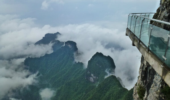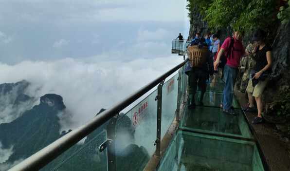 到天門山一定要走一次玻璃棧道,會(huì)讓你有一次終生難忘的懸崖終極體驗(yàn)。棧道除了每隔一米左右用鋼筋混凝土搭一截支架外,全部是透明度極高的鋼化玻璃。赤裸裸的透明挑戰(zhàn)你的“敢”覺,迎接你的尖叫!