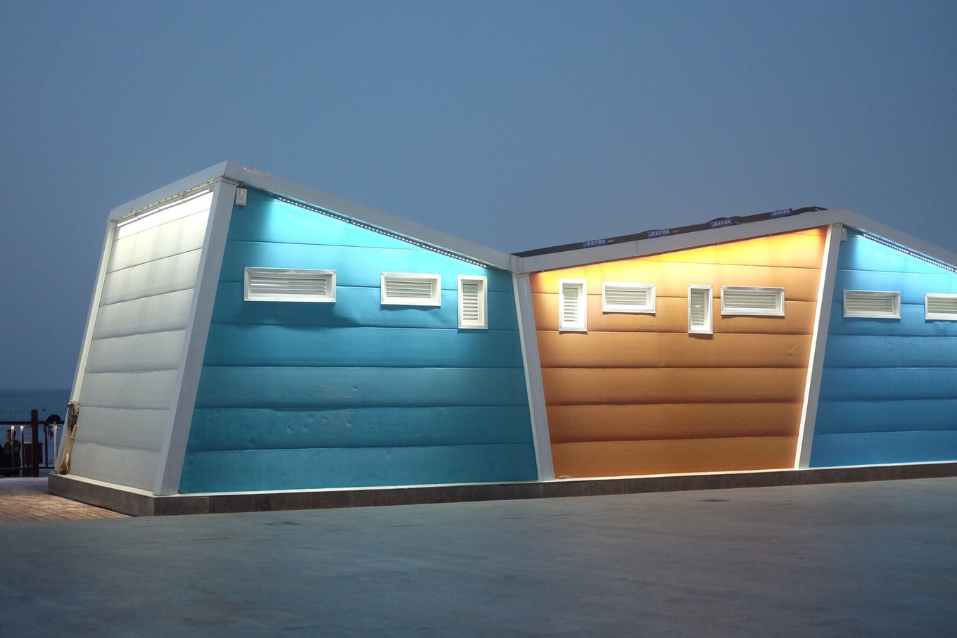 晚上本來想去第一海水浴場,月亮灣那邊,結(jié)果一查評價,說不行。然后又想改去第二海水浴場,一查評價又不行…最后決定去煙大對面的浴場看看。想著好歹旁邊有個大學(xué)嘛還可以逛逛大學(xué)。浴場的話就都是人游泳…然后這邊的浴場有些小房子顏色還挺好看的,拍了一張。