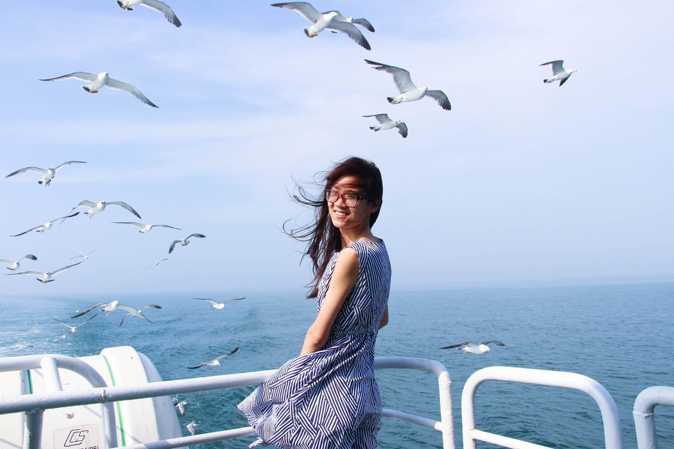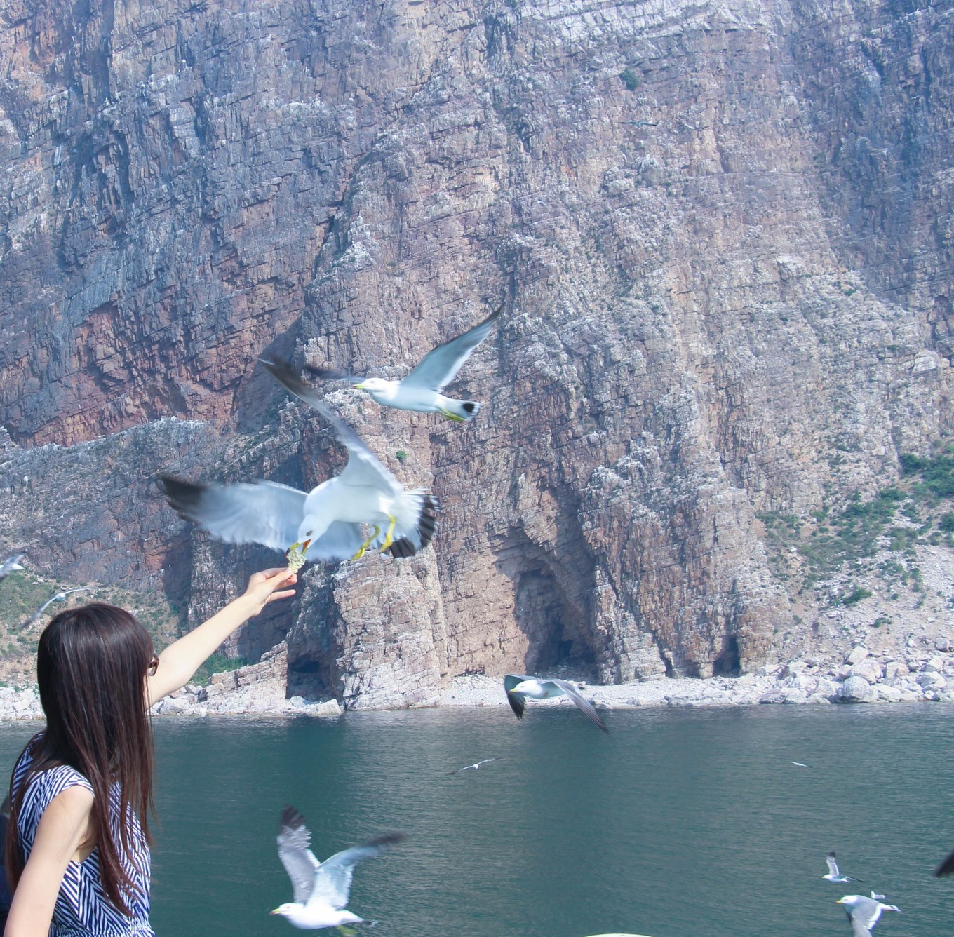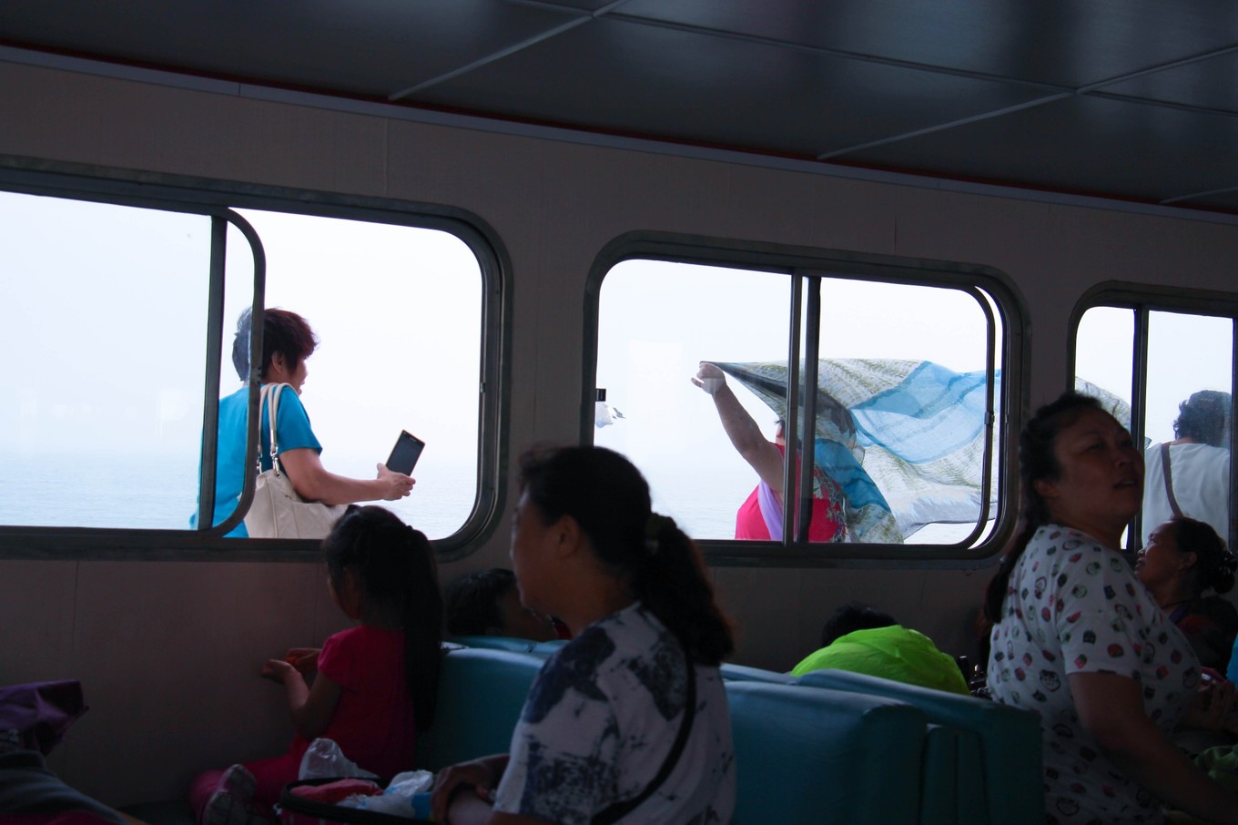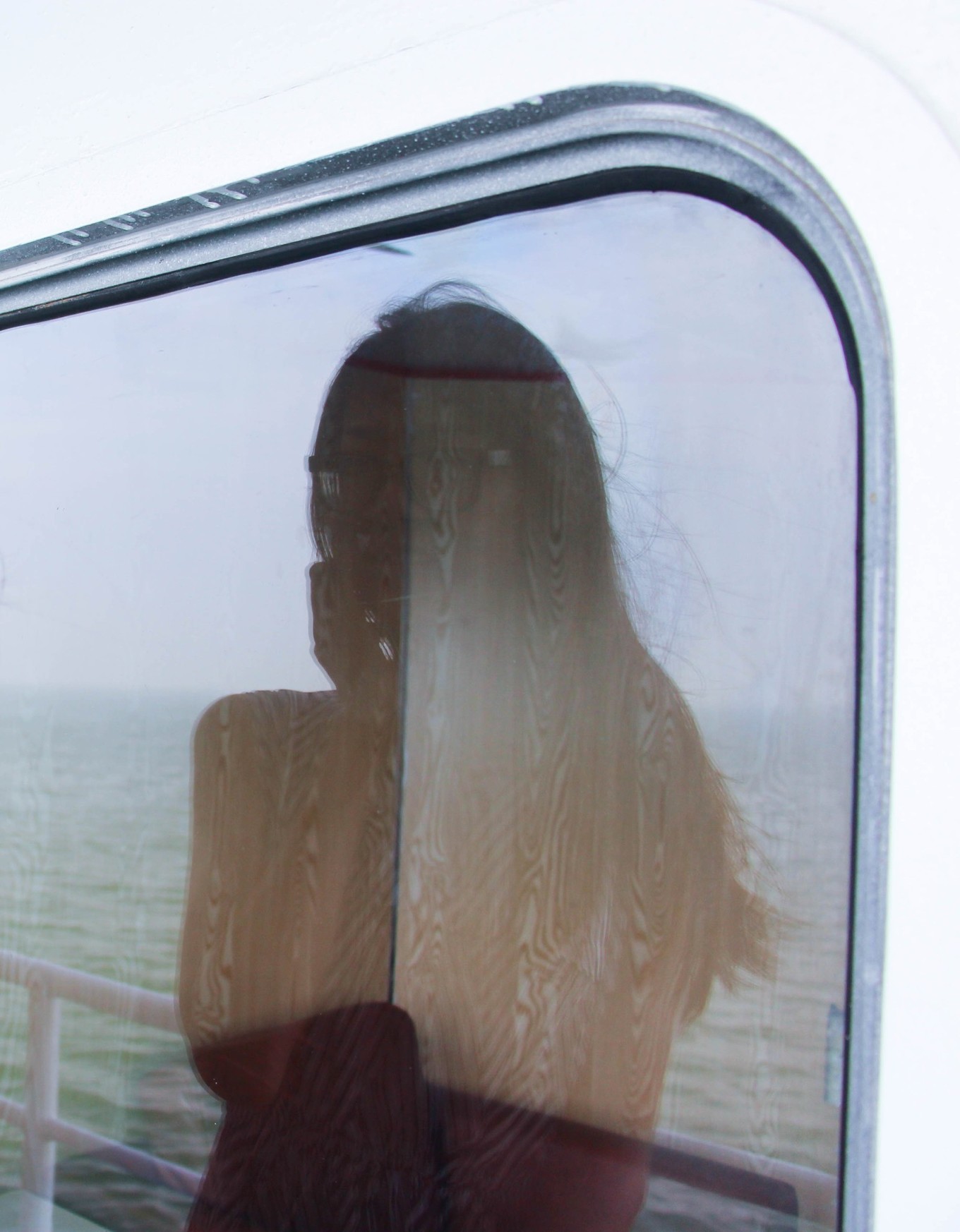 海風確實太大,待久了有點涼,所以回到船艙暖和暖和,意外發(fā)現(xiàn)窗外兩個阿姨正在拍照。比我的道具高級多了,那大絲巾飛舞的,飄逸的。。。。好羨慕。。。