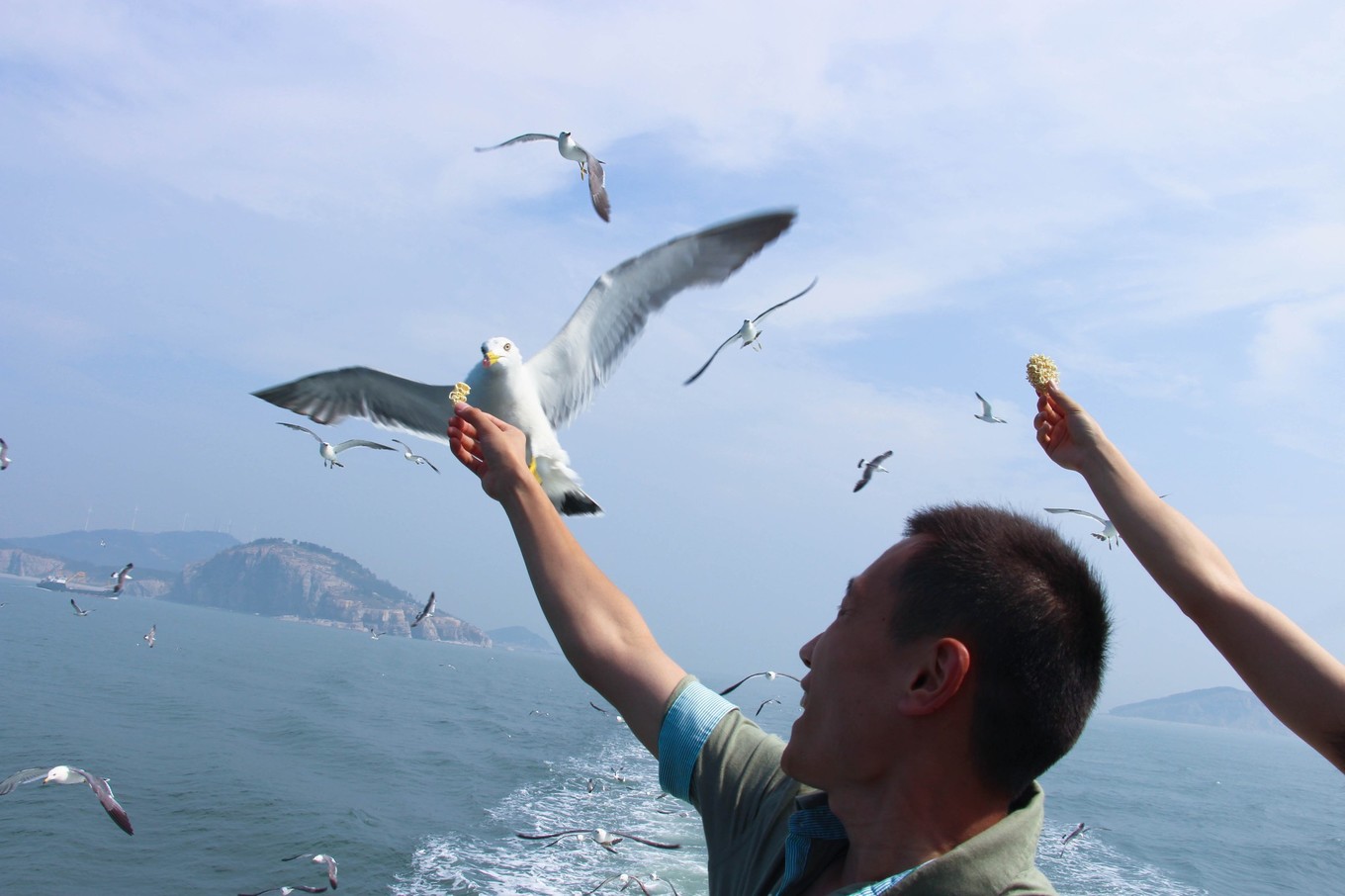 某男很榮幸地成為本船在手邊喂到海鷗的第一人,該男子開心地咧開了大嘴