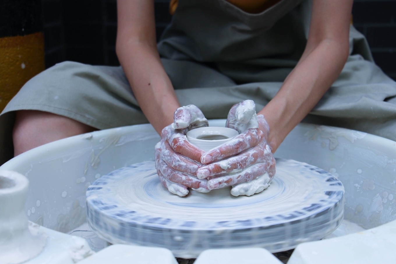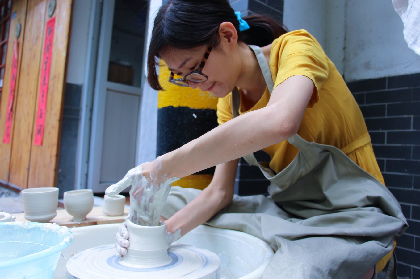 老街很短,十來分鐘夠走個來回,我們在河邊的一個陶藝店家停了下來,山東藝術(shù)學院的一個老師開的店,平時大二大三她的學生也就直接來這里實習。同為老師,特別被她這種耐心細致溫和的語調(diào)吸引,我忍不住試了把手。