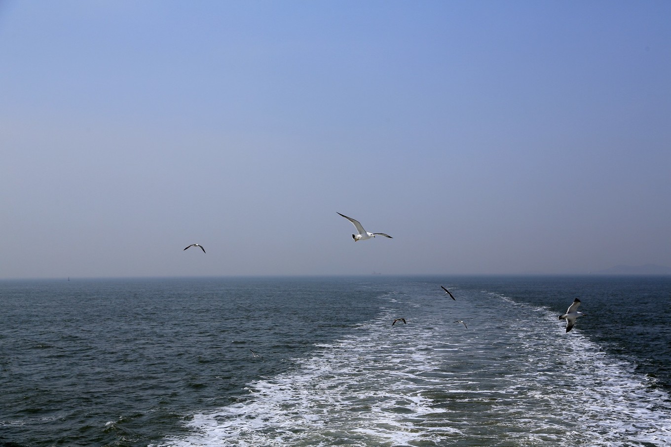 幸運(yùn)的是,在回程的輪渡上,有十幾只海鷗圍著我們的船,忽高忽低的飛,像是在歡送遠(yuǎn)道而來的朋友。