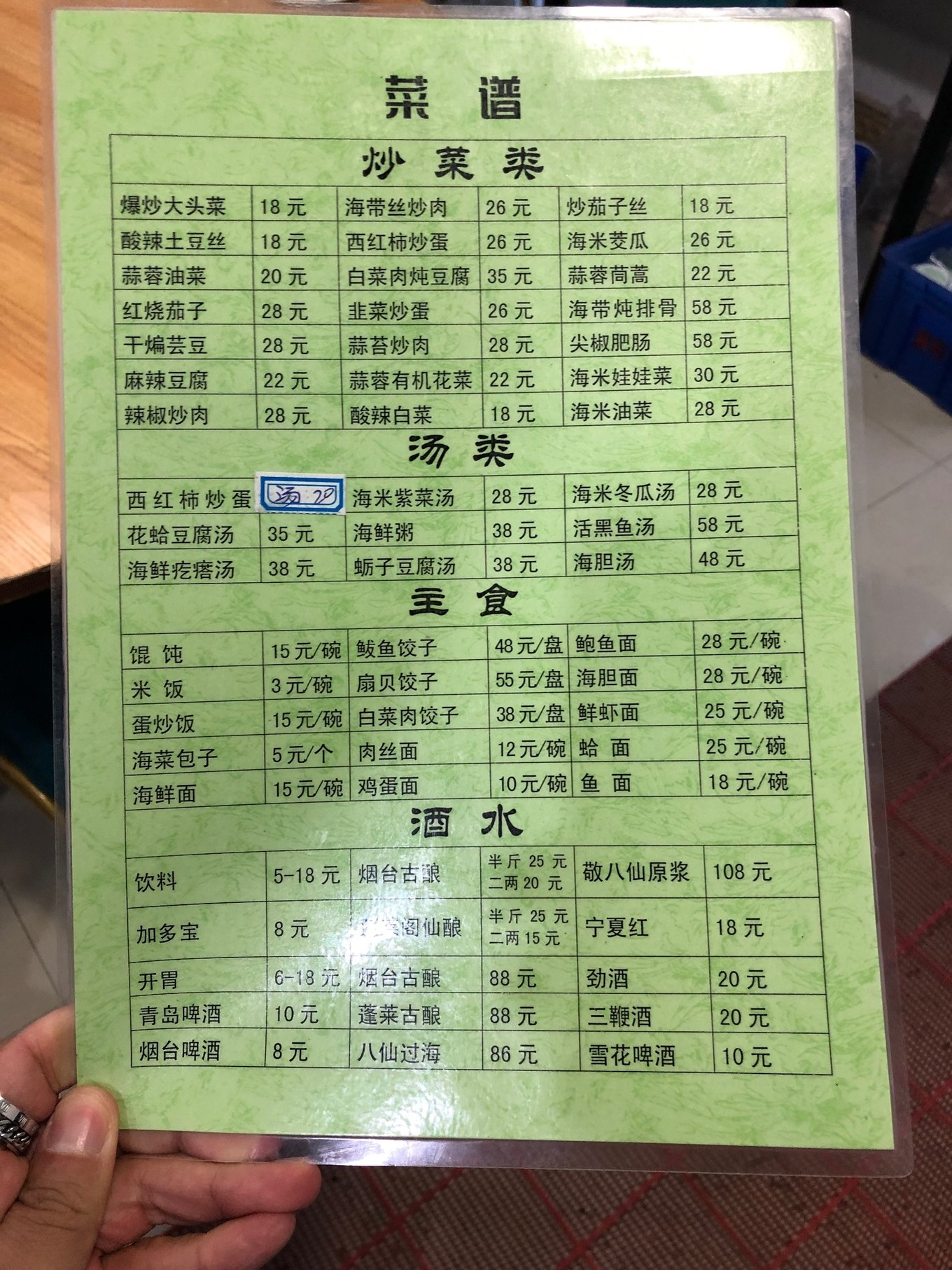 而午飯和晚飯呢,有兩種,如果您是選擇了漁家樂(lè),那估計(jì)我的參考意義不大了,因?yàn)橛行O家樂(lè)管午飯晚飯,但我沒(méi)體驗(yàn)這個(gè),所以不敢亂說(shuō)。另外一種,就是下館子了。來(lái)之前就在網(wǎng)上查過(guò),長(zhǎng)島出海鮮,但并不便宜,甚至比煙臺(tái)、蓬萊還貴。果不其然,筆者從大眾點(diǎn)評(píng)搜了排名靠前的兩家以海鮮為主的餐廳,價(jià)格都不低,發(fā)一下菜譜,供大家參考。