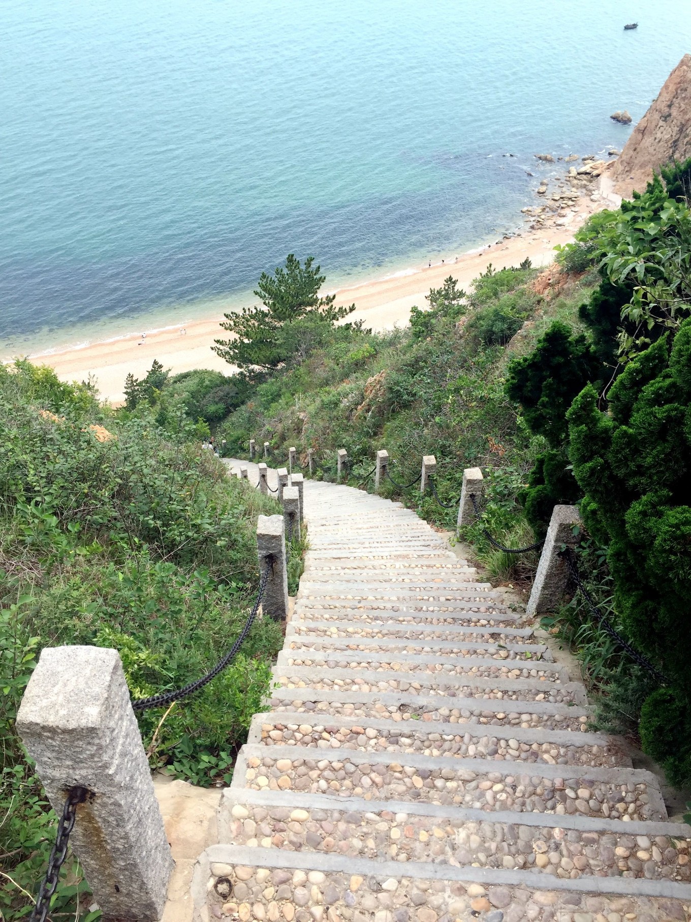 臨海最有名的便是369臺(tái)階,師傅問我想爬上還是走下,果斷選擇下。。于是車停到369階上面,下去沿著海眼線就能走到黃渤海交匯的紀(jì)念碑,在順著漫道就可以走到黃渤海的交匯海灘上。但我覺得369階附近的景色真的美絕了~~~交界處顯然遜色了很多
