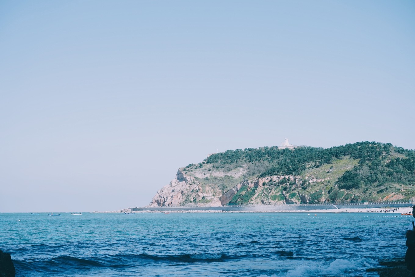 一早來(lái)到烽山林海,出租車送我們到山腳下,排隊(duì)乘免費(fèi)的電瓶車上山。今天海上有點(diǎn)霧氣,看不到海平面,大朵的白云下就是粼粼海面,真正的“海天一色”了。接著我們走到了黃渤海分界線的界碑,放眼望去,黃渤海真的顏色不同,分界線呈S狀,旁邊的高樓仙霧繚繞,我還以為是海市蜃樓,被告知是蓬萊,怪不得叫“蓬萊仙境”……