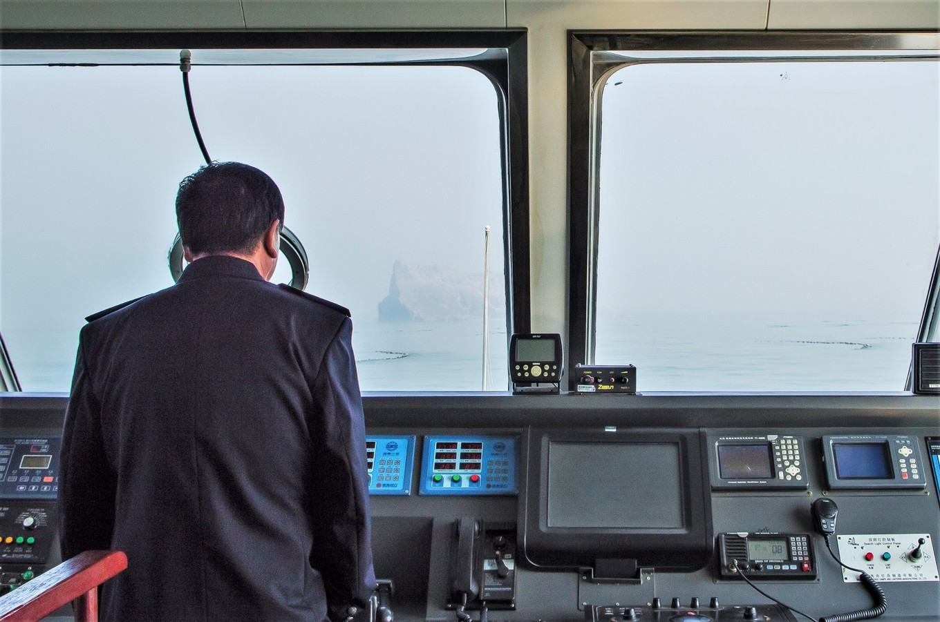 這是船上的一位水手。過了萬鳥島,很奇妙地我們便聊了起來,旁邊還有幾個游客在聽。我便喚他叔。叔的皮膚被曬被皸裂干燥,航行路上海風較大,叔沒說一會便流下幾滴眼淚,他說做這行做了三十多年了。傾其一生只做一件事,他有著對大海的無比深切的感情,有著對無償給予我們資源的大海的敬畏之心,讓我很是動容。一路上他給我講我們走的水路便是國際航道,那黃的是貨船,白的便是客船。海豹礁的那些每年早春洄游的海豹,還有他們釣魚的島。以前他在島上工作的時候,要穿好長好長到膝蓋的靴子,因為島上有“輻射”啊,我半響才回過神來,“蝮蛇”不由一笑。碰到叔說的比較讓人聽不懂的話,我便再說一遍。叔說我只會說土話,小陳給我翻譯頂好。哦,叔叫我小陳。等到了廟島的時候,叔和我說廟島以前是個監(jiān)獄,以前的漁民他們沒有指南針啊,那晚上找不到路回來了怎么辦,那他們看到了廟島上的燈光,可以到廟島等到白天在啟程回去。之后這里啊就建了媽祖廟,每年都會有“海神娘娘”廟會,漁民會去祈愿還愿,祈求海神的保佑,廟會可以說是長島最熱鬧的日子了。