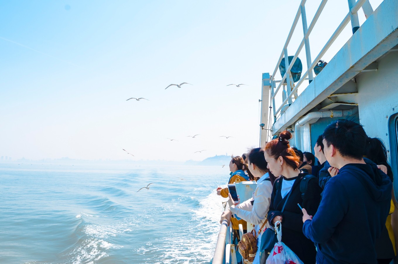 等我們離港口越來越遠的時候,海鷗愈來愈多,船上的旅客都被眼前的景象所吸引,有的游客拿了些面包來喂海鷗。海鷗在天空飛的樣子真的很不一樣,同行的伙伴一開始還以為是模型鳥,逗得我哭笑不得。