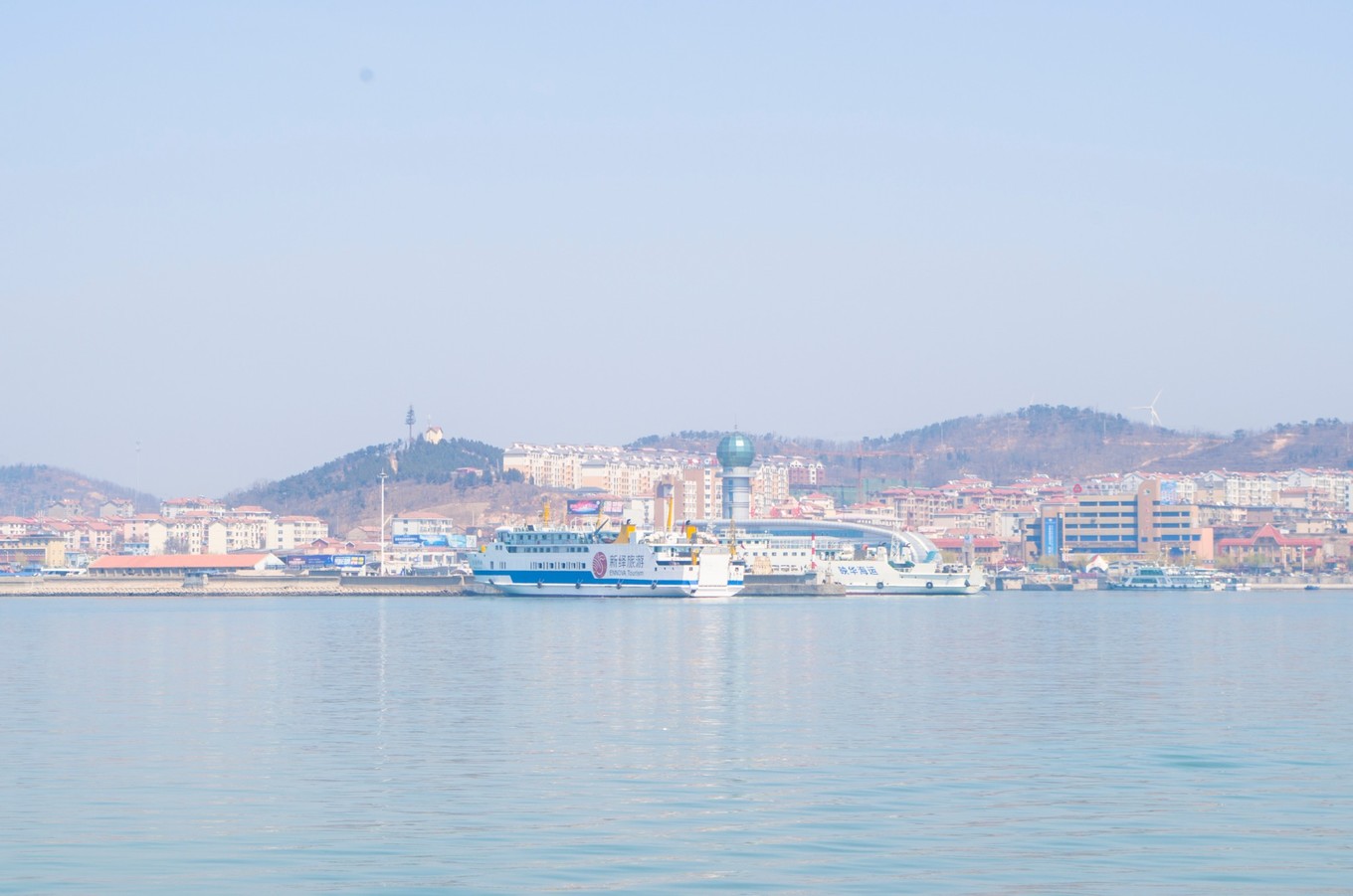 徐州晚上的火車到煙臺已是十點多了,出了火車站我們便提前約了司機,直接上蓬萊港了。蓬萊港的附近就是蓬萊閣(四大名樓之一,其他三個:黃鶴樓、滕王閣與岳陽樓),還有個海洋世界。我們還是先打算買票過去,蓬萊港只售臨近的航班的票,所以買完票基本上就要直接上船了。另如果不需要保險的話,一定要說不要保險,不然工作人員都是默認的。30/人,保險3/人,30+min。