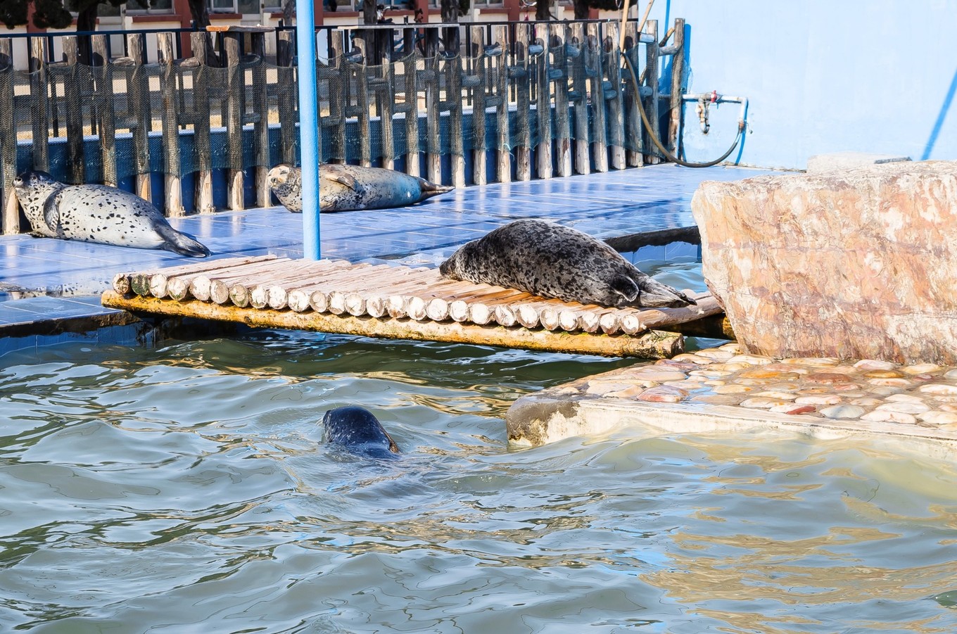 景區(qū)的右邊還有個海豹苑,這些都是飼養(yǎng)的海豹。中間的那只懶洋洋地趴在上面曬太陽,甚是可愛。