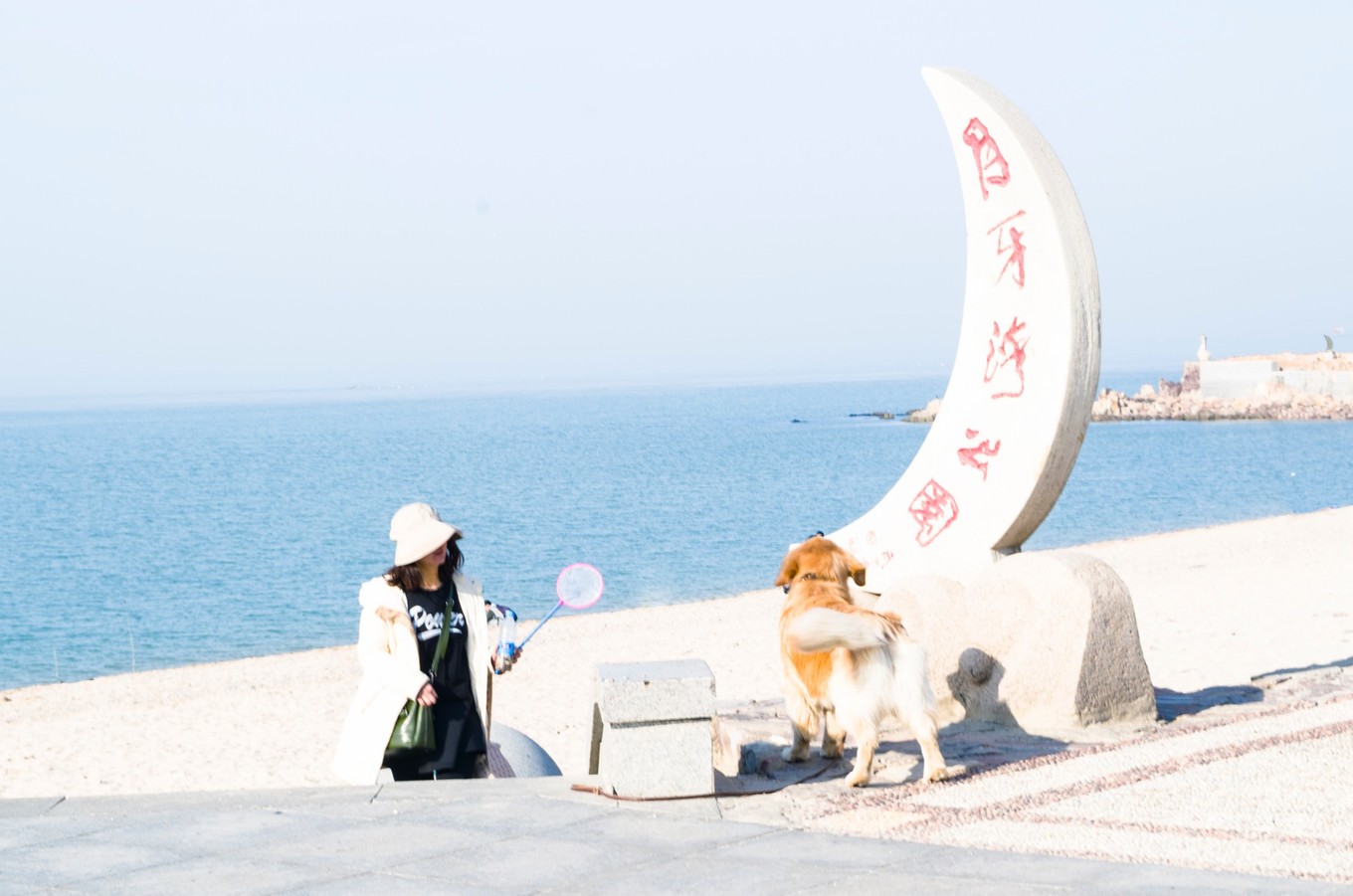 月牙灣,海灣形似月牙而得名。確實和一般的海灘不一樣,這里沒有沙灘。確切的說,這是礫石灘。月牙灣懷抱如明鏡一般的碧水,和五顏六色的球石呼應起來,真真是美不勝收。這些球石都是附近的山巒上掉落下來的,大自然的造物能力真奇妙啊。那個時候,遠處看到她牽著狗走在海邊,隨性便按下了快門。夏天的時候,還會有一些海上娛樂項目,不過對我來說無關緊要。游覽時間1-2小時,月牙灣+九丈崖 學生價40。