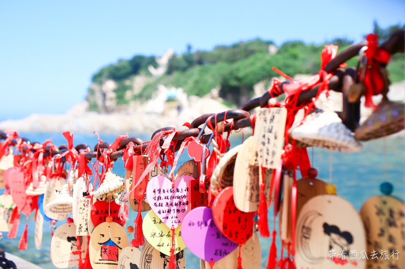 順著沿海路往下走,來到了另外一個(gè)景點(diǎn)——月牙灣,很多旅行團(tuán)都會(huì)帶到這里來,其實(shí)除了一個(gè)金屬的月亮雕塑,沒有別的,連照片都懶得拍,因?yàn)榇鬆敶髬尃幭瓤趾?,互不相讓。月牙灣旁邊的鐵鏈上綁滿了這種心愿牌。