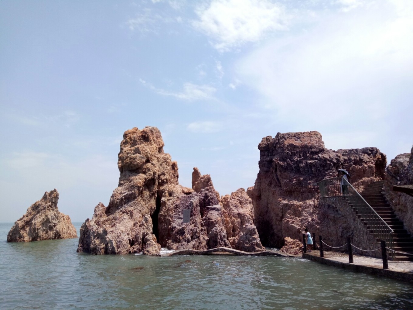 第一站前往望夫礁自然景區(qū)。望夫礁即望福礁也,坐落在南長山島的最北端,北與北長山島隔海相望,東與大小竹山島遙相呼應(yīng),集山、海、灘、礁、洞、自然景觀和亭臺(tái)、樓閣、神話傳說等豐富的人文景觀于一身,景色優(yōu)美,形象生動(dòng),尤其以灘岸之首的望福石造化天成,形象逼真,形狀極像一婦女頭戴圍巾,懷抱嬰兒迎風(fēng)而立,好像在等丈夫歸來,故此人稱此礁為“望夫礁”,又似海神媽祖的化身在此為過往行船保駕護(hù)航,納福迎祥,遂喚其為望夫石。相傳一位美麗的妻子,面對海面遙遙相望,等待遠(yuǎn)航的丈夫歸來,無論風(fēng)吹日曬雨淋都不曾離去,久而久之化作了一座礁石,永生永世佇立在海邊。望夫礁是天然形成的石頭,沒有經(jīng)過人工雕琢,是由頁巖和石英巖石交替疊加形成的。