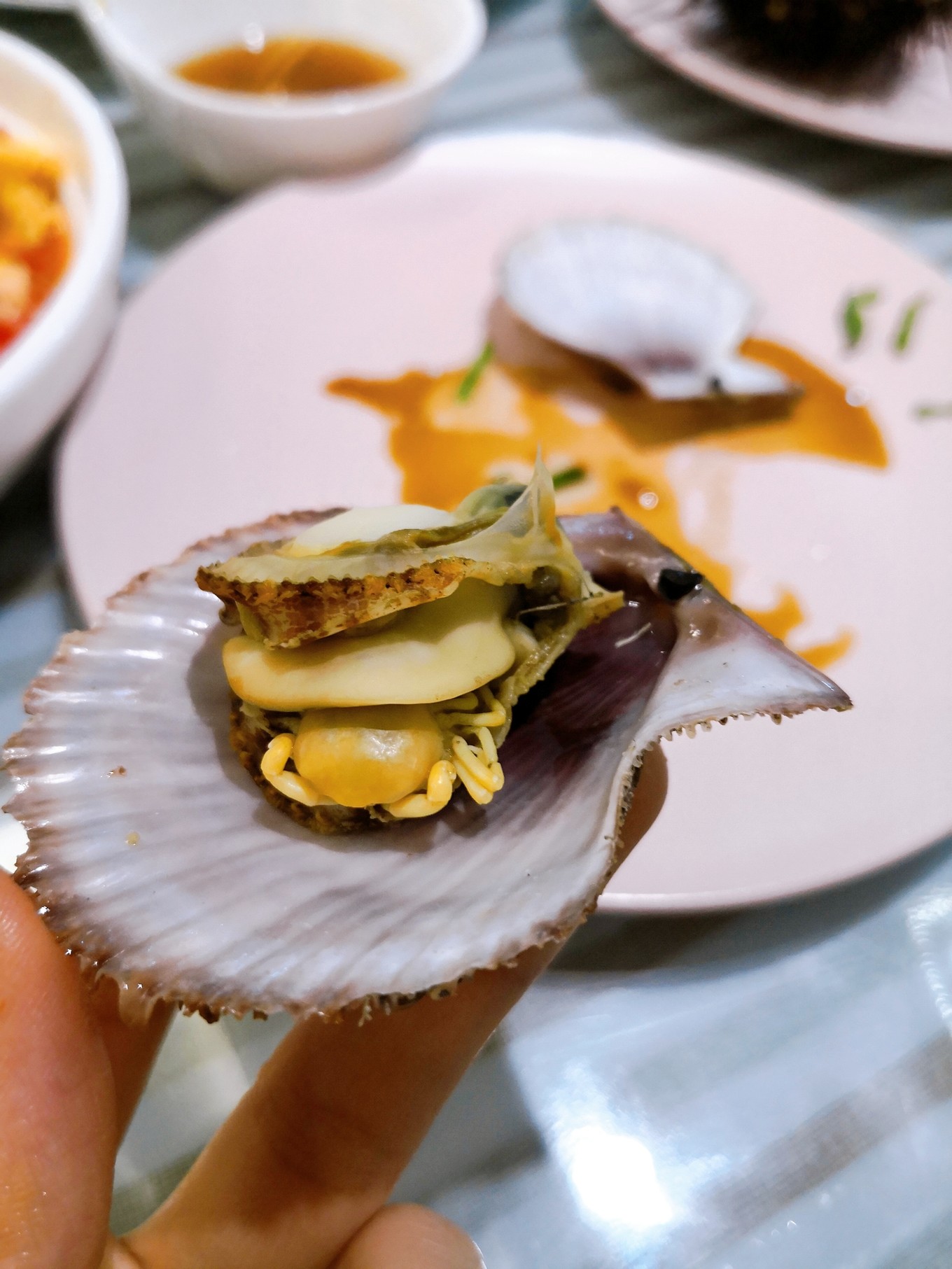 晚餐加住宿。晚餐真的超級(jí)豐盛呀,老板娘冷大姐給我們兩個(gè)人準(zhǔn)備了十盤菜,海鮮特別新鮮,肉質(zhì)鮮美。怒贊黃花魚、鮑魚、海膽和生蠔。大姐調(diào)的醋汁和蘸料味道很好,給海鮮增味了不少。六月剛好是蓬萊的休漁期,但是漁家還可以在近海小規(guī)模打魚,所以海鮮依然是很新鮮的,比養(yǎng)殖的更好吃。我們甚至在扇貝中看到了扇貝生前吃下的小螃蟹,小螃蟹殼是軟的,里面基本沒肉,但是咬開能吃到很嫩的蟹黃,太有意思了。給海膽一萬字好評(píng)!