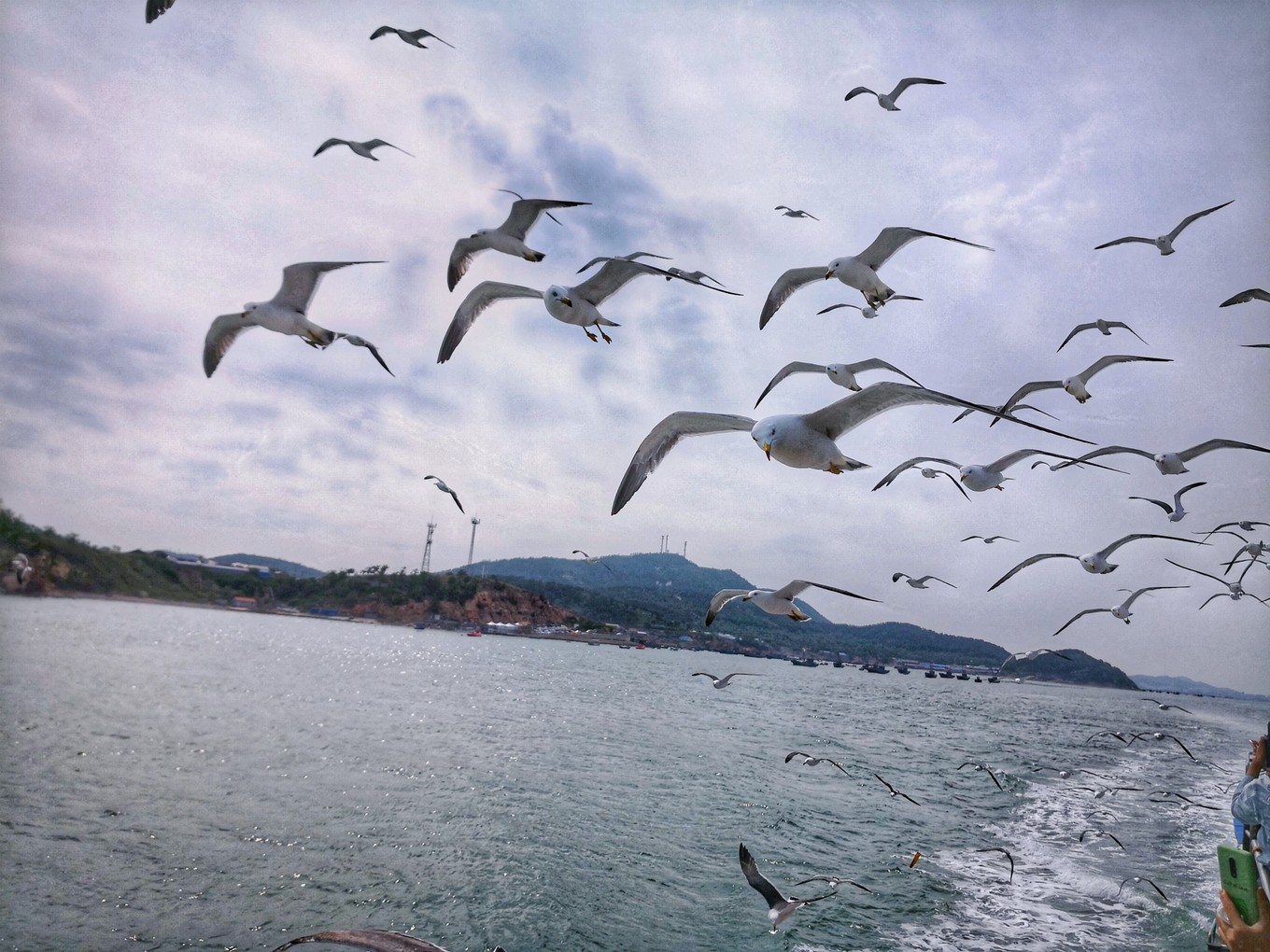 因?yàn)橐獩_過去叼魚腸,海鷗一般會(huì)比游船的速度快,所以它們飛到船頭會(huì)掉頭回船尾排隊(duì)沖過來進(jìn)行下一次叼食。