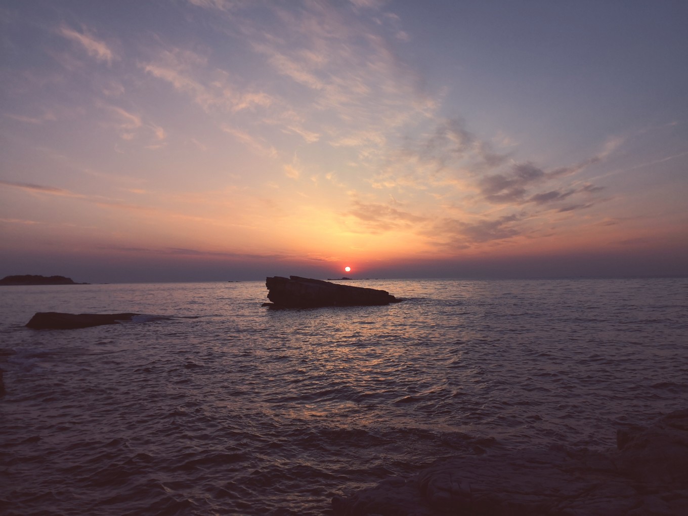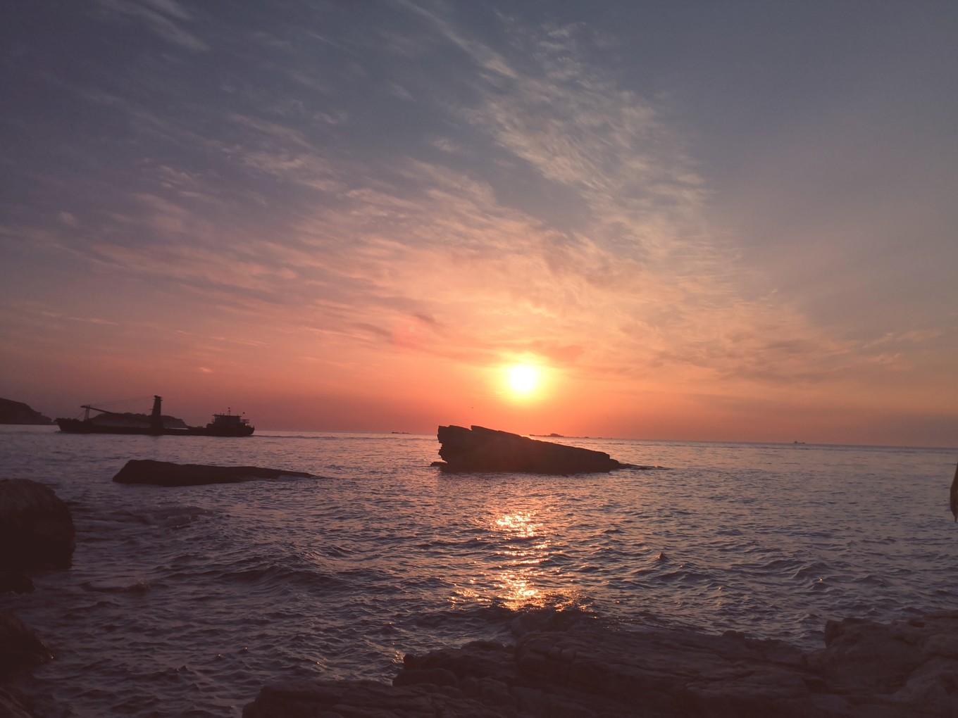 離開月牙灣去九丈崖的時(shí)候已經(jīng)累成狗了,畢竟在鵝卵石上走了將近兩個(gè)小時(shí)。所以看到九丈崖的n多臺(tái)階時(shí)內(nèi)心基本是崩潰的。我們大概五點(diǎn)半到九丈崖,夏天日落比較晚,我們一路走走歇歇基本快七點(diǎn)才到眺望臺(tái),找了塊視角不錯(cuò)的礁石,坐在上面看日落,等了好久才等到日落。天氣不錯(cuò),特別給力,沒有下雨沒霧氣。日落很美,太陽把云彩染成了溫柔的粉色。太陽接近海面后,過了不到一分鐘就完全落下去了,現(xiàn)場(chǎng)看到真的很震撼,不枉我們餓著肚子看完日落。日落后返程的時(shí)候才發(fā)現(xiàn)珍珠港前面山坡上的燈塔附近看落日視野更好,建議大家不要都擠在眺望臺(tái)的礁石上,后面的視角更好呢。
