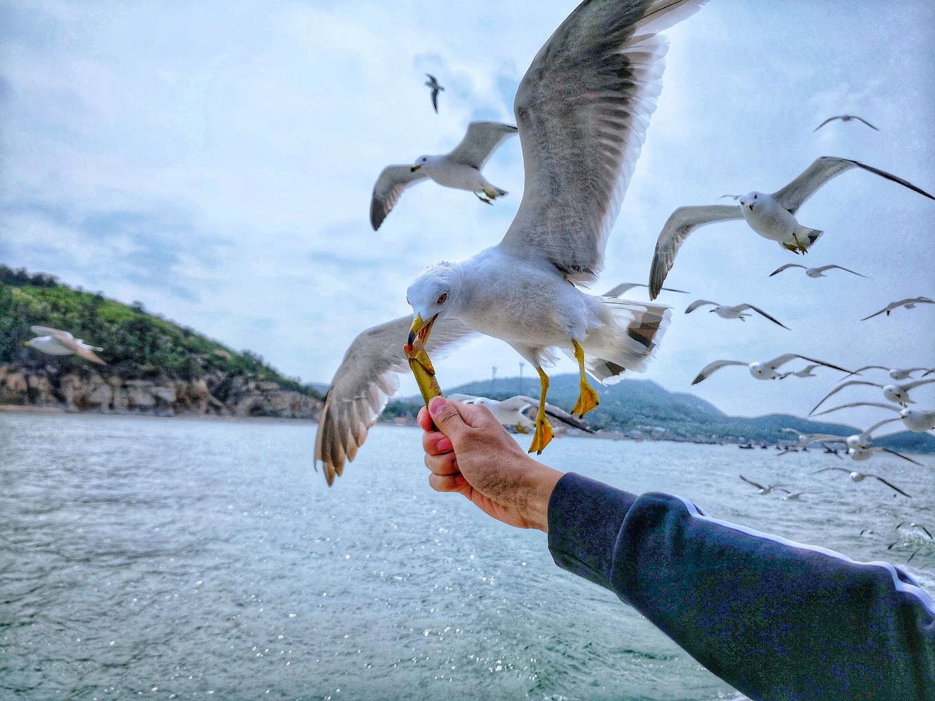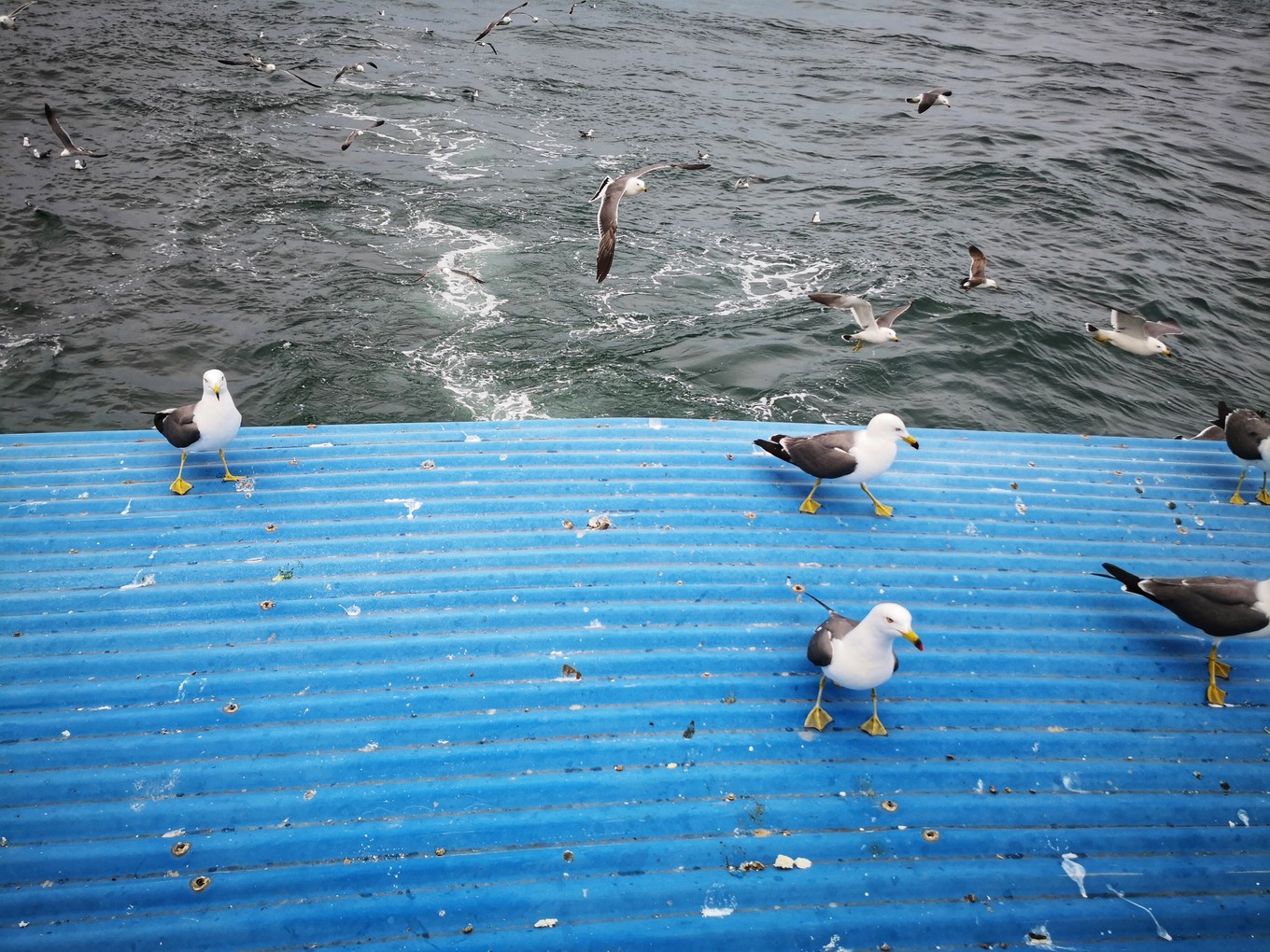 喂海鷗最好玩了,可以把海鷗專用魚腸掰開成小塊兒,拋給海鷗,也可以直接舉著魚腸,海鷗會(huì)很大膽的飛過來叼魚腸,我有看到有人沒拿穩(wěn)魚腸,一整條都被海鷗叼走的。船尾有塊小板子,有些海鷗干脆站在上面等著人們往板子上扔魚腸,看到一只巨兇狠的海鷗一邊大叫向游人要魚腸還一邊兇其他海鷗,鳥狠話不多。