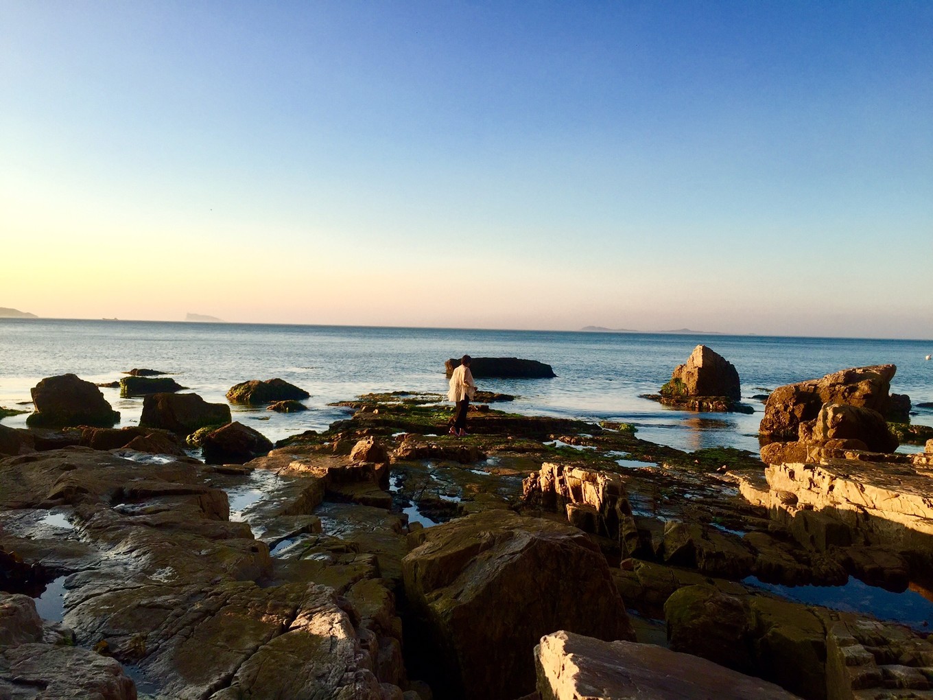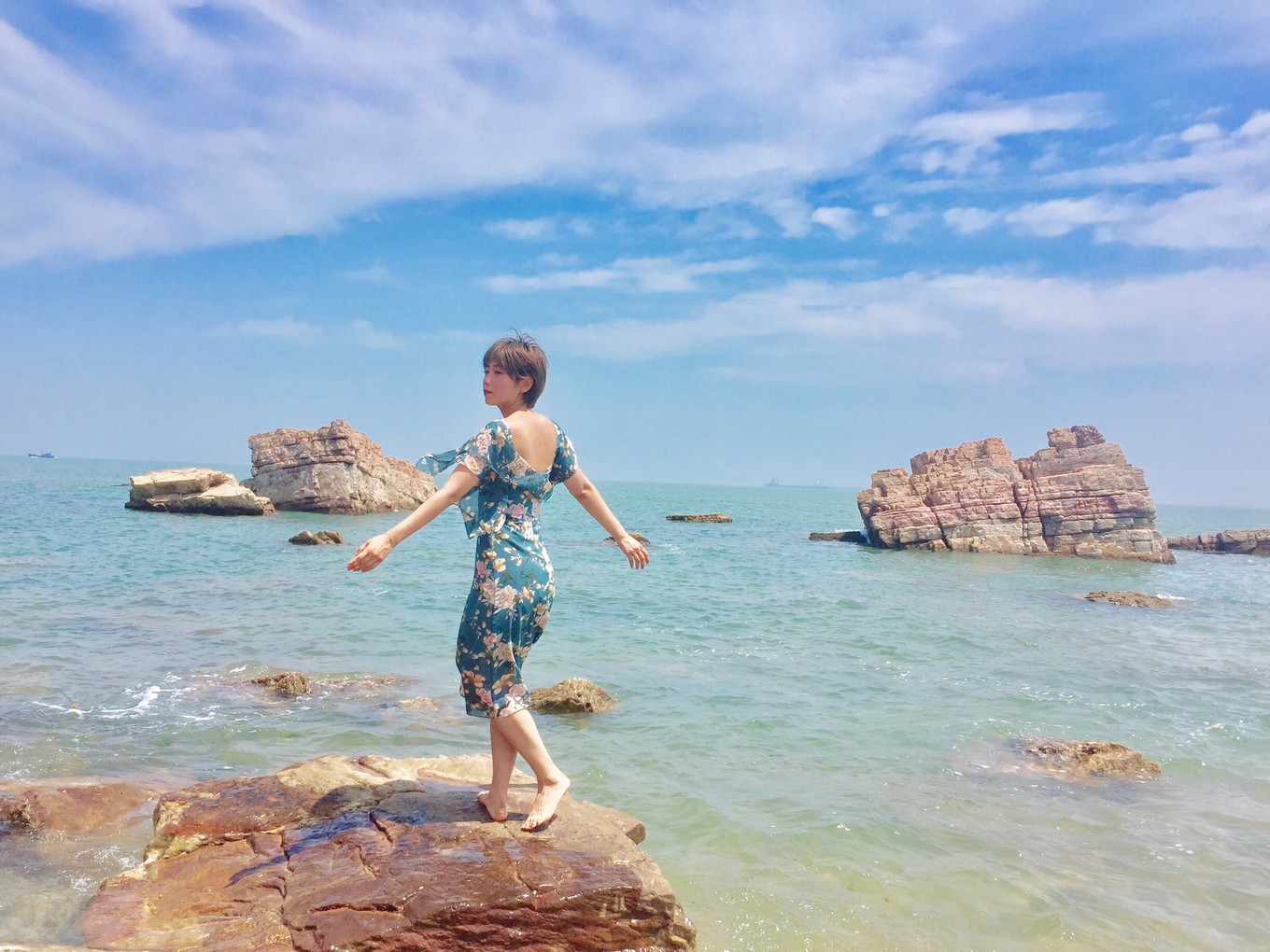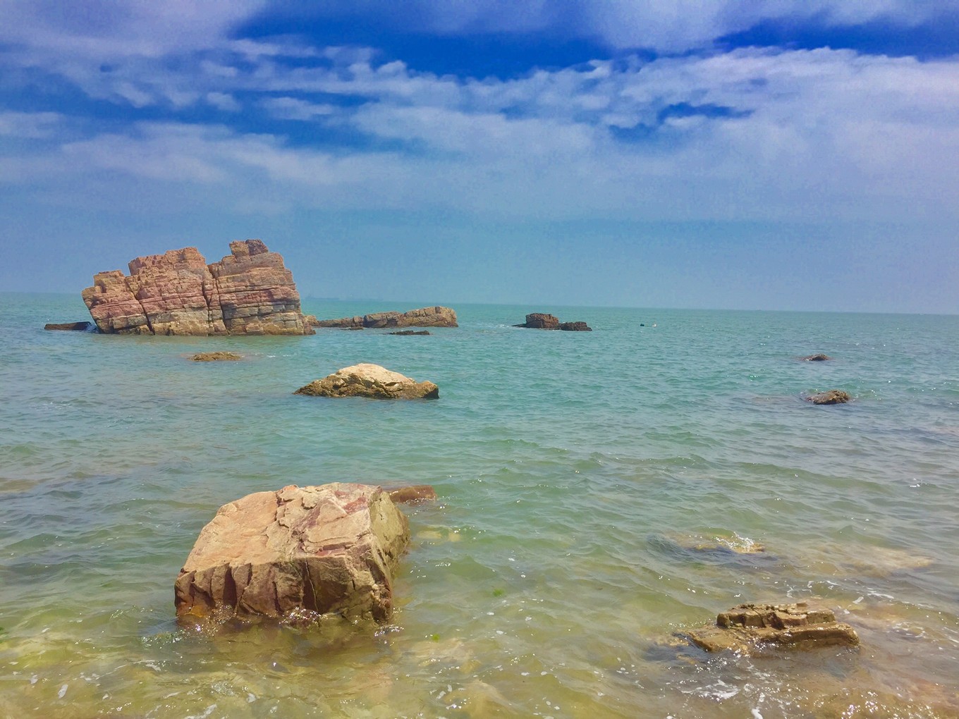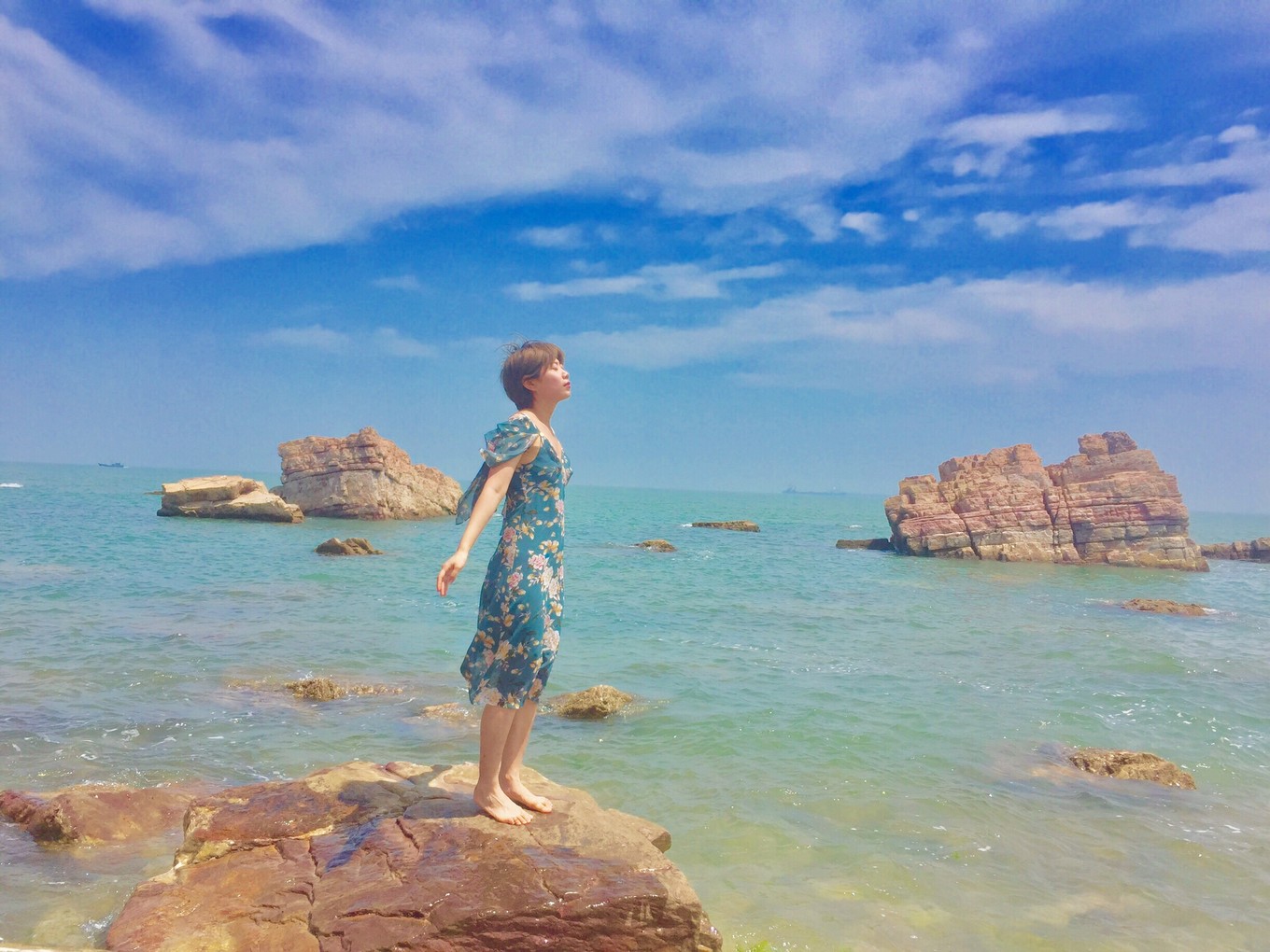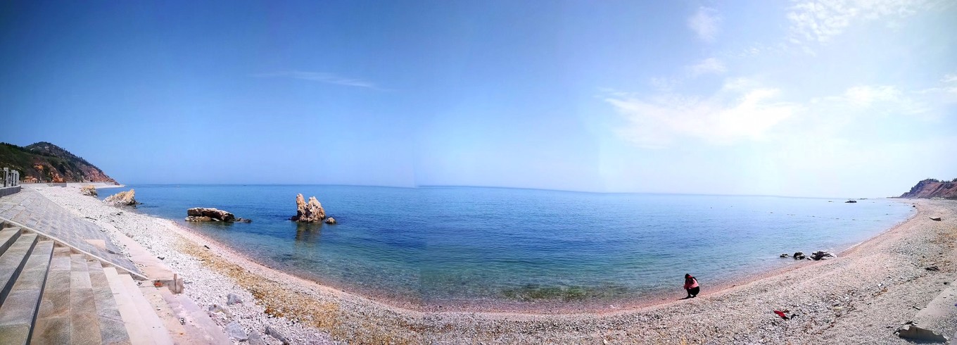 長(zhǎng)島必打卡之二,之三分別是月牙灣,萬(wàn)鳥島。先來(lái)說(shuō)月牙灣。顧名思義,海岸線彎彎的樣子像一灣水月。月牙灣的特色是球石鋪滿的海灘,踩上去,也算是足浴spa了。長(zhǎng)島的自然環(huán)境真的很贊,青藍(lán)的海水;碧空如洗;綿糯的云片,像撒上天空的鵝絨般輕盈;造型獨(dú)特的奇怪礁石。就是現(xiàn)在的人文開發(fā)差點(diǎn)意思,一進(jìn)海灘的那幾排藍(lán)色大排檔專用傘,拉低了整個(gè)氛圍。一個(gè)傘下擠了好幾排塑料桌椅。所幸來(lái)長(zhǎng)島旅游的人還是有限的,長(zhǎng)長(zhǎng)海岸線邊也就擺了二百米的大傘足夠使用。于是在遠(yuǎn)離人群的地方閑逛,吹吹海風(fēng),雖然暴露在陽(yáng)光下,也沒(méi)覺(jué)得炎熱。遠(yuǎn)眺,一方寧?kù)o盡收眼底與心間。