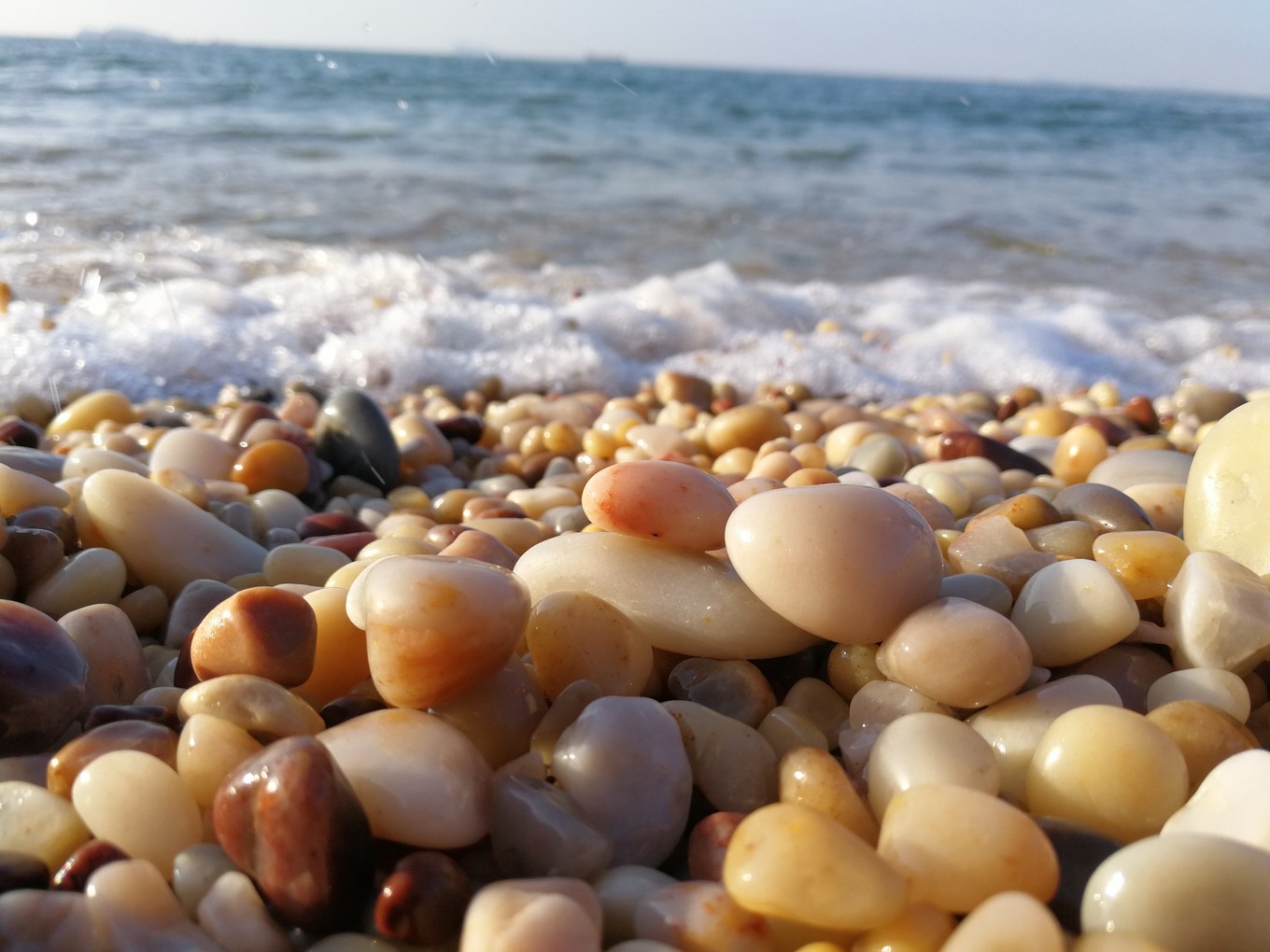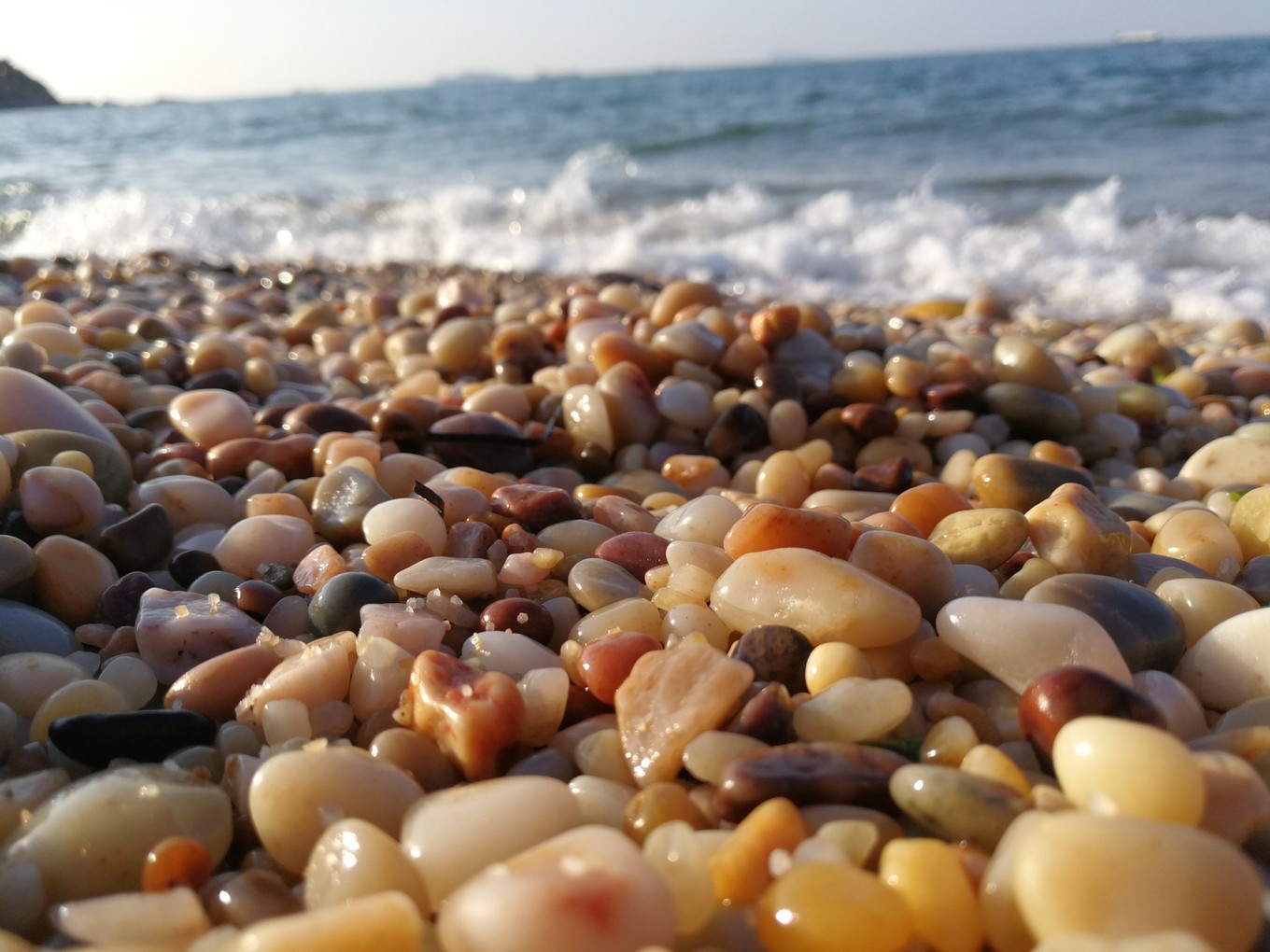 藍色海水晶瑩剔透,白色浪花溫柔撫摸球石,圓潤五彩的球石在陽光下熠熠生輝、五彩斑斕