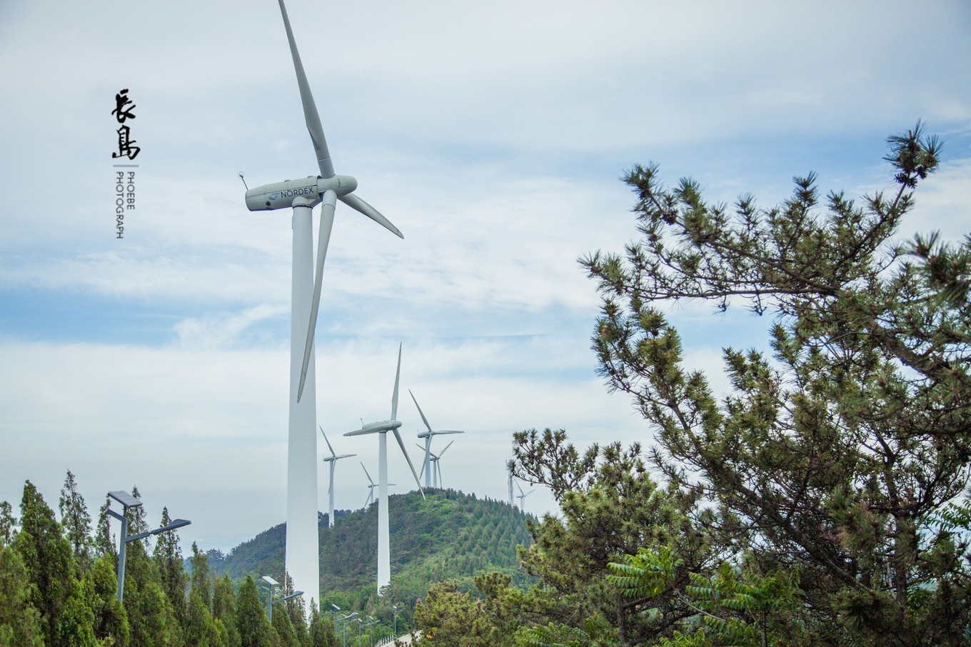 林海公園中,發(fā)電風(fēng)機(jī)矗立在路的兩側(cè)。當(dāng)?shù)厝苏f這些風(fēng)機(jī)發(fā)的電并不只供長(zhǎng)島使用,還要通過海底電纜輸送給隔海相望的蓬萊。
