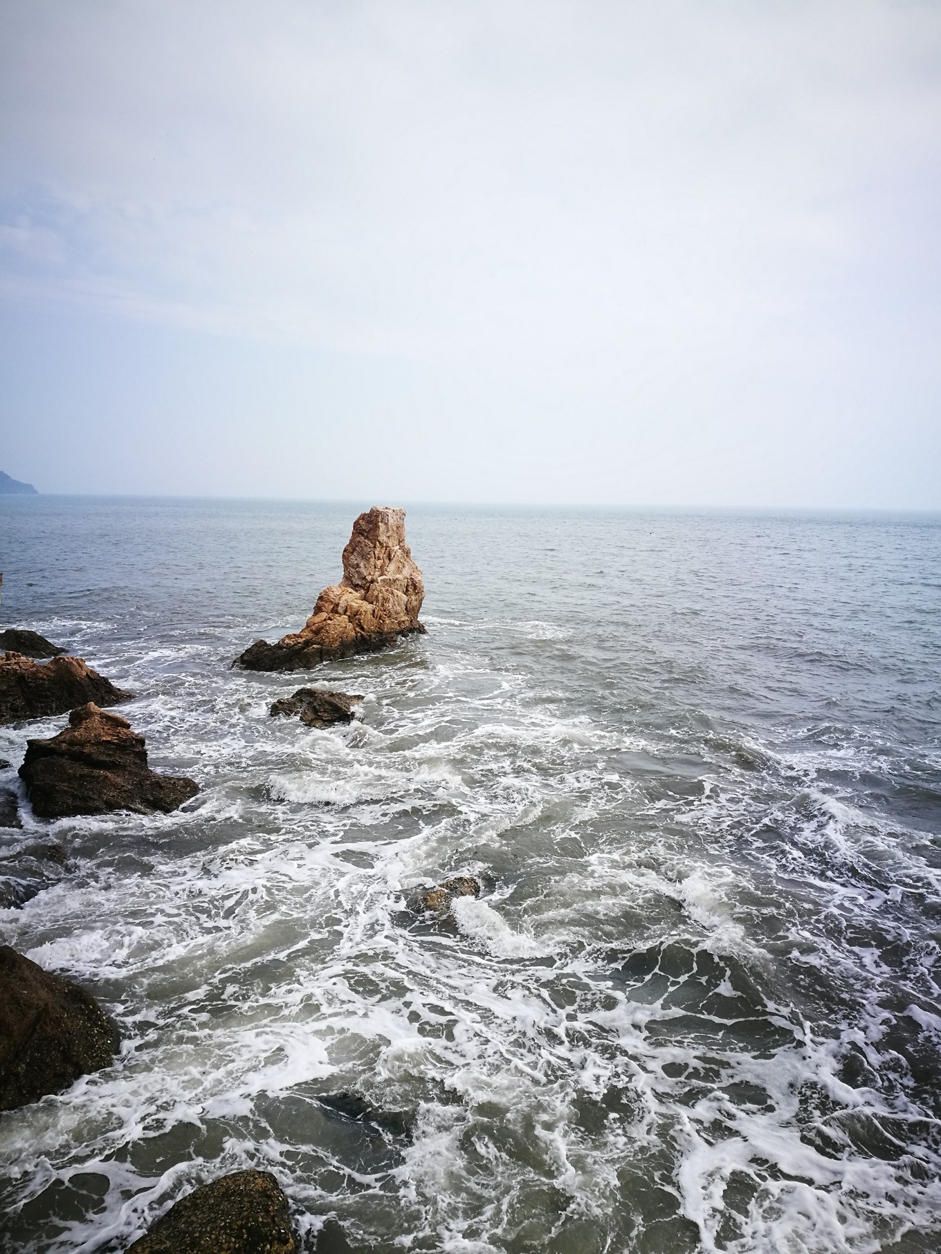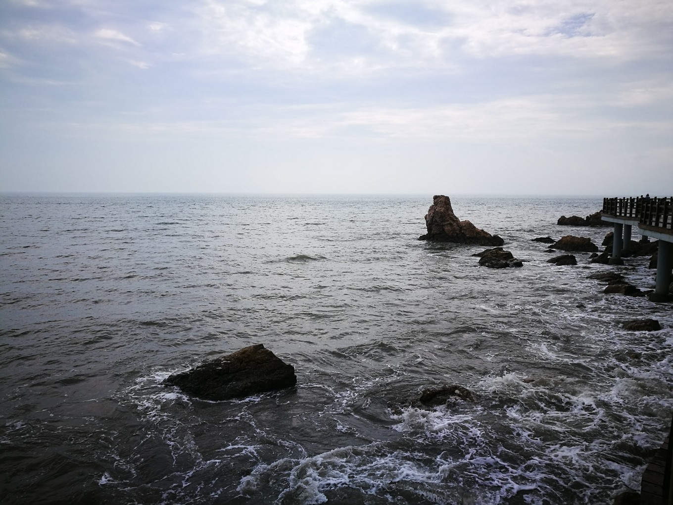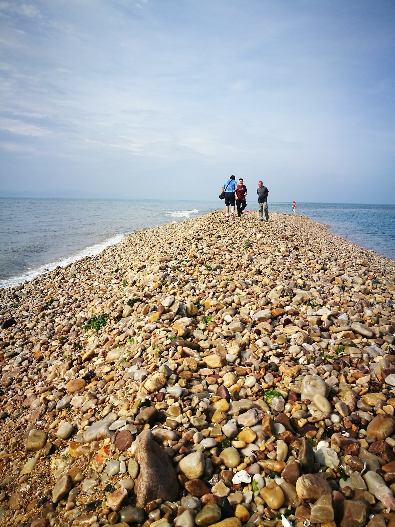 照片的左側(cè)是黃海,海水略黃,波濤洶涌,推動(dòng)著球石前后滾動(dòng),發(fā)出清脆悅耳的聲音。右側(cè)是渤海,風(fēng)平浪靜,海水是深藍(lán)色,據(jù)說兩邊海水鹽度不同造成的。