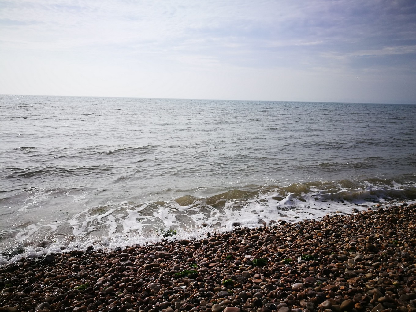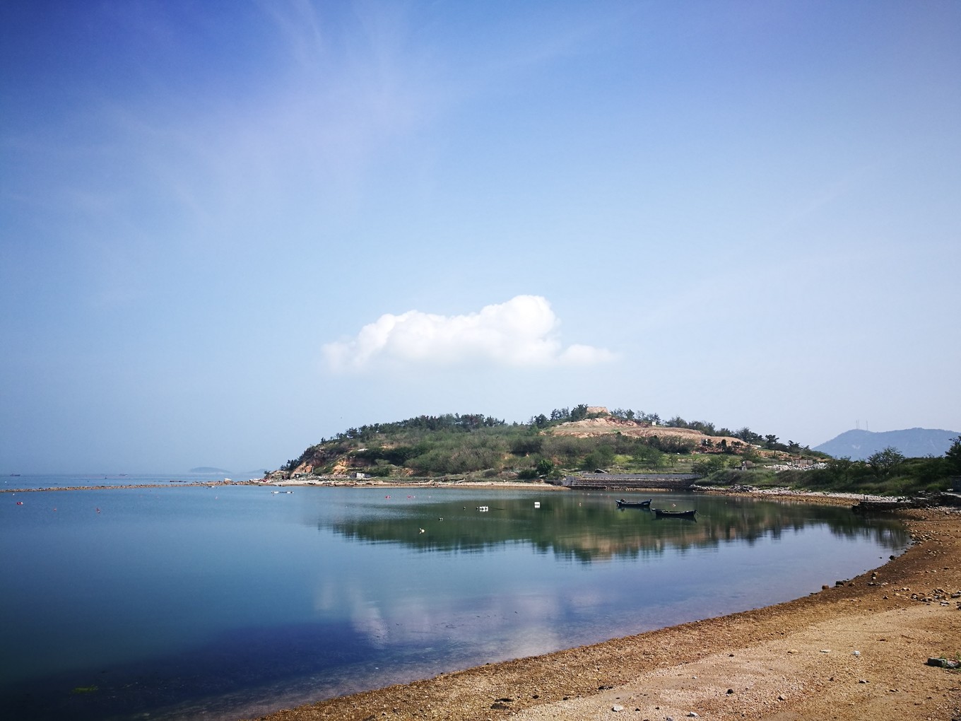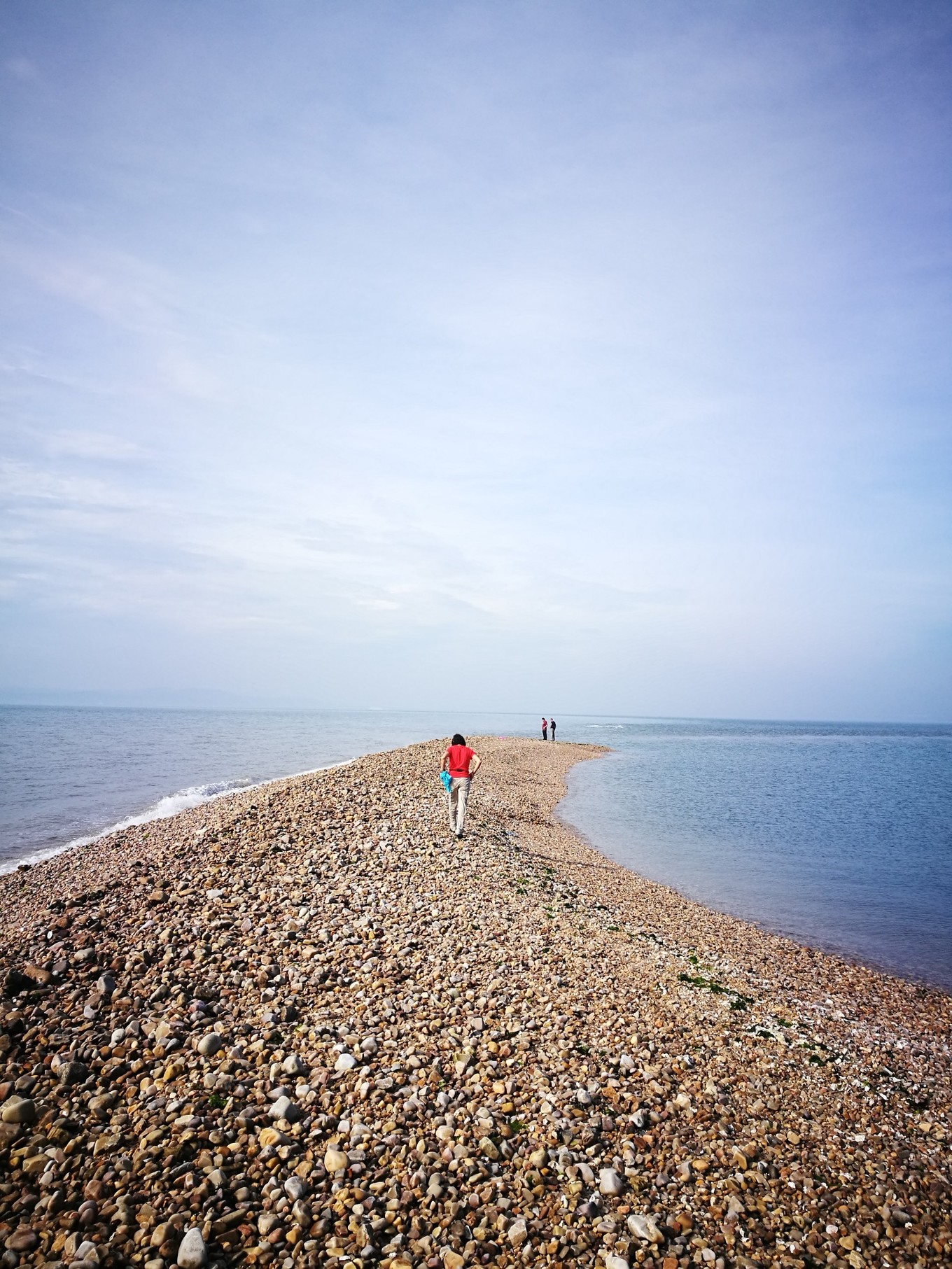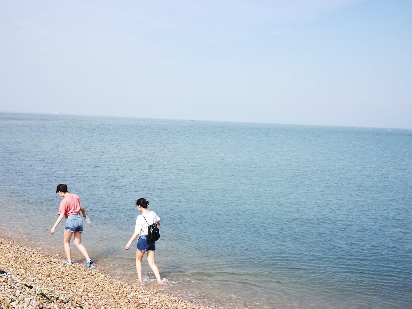 照片的左側(cè)是黃海,海水略黃,波濤洶涌,推動(dòng)著球石前后滾動(dòng),發(fā)出清脆悅耳的聲音。右側(cè)是渤海,風(fēng)平浪靜,海水是深藍(lán)色,據(jù)說兩邊海水鹽度不同造成的。