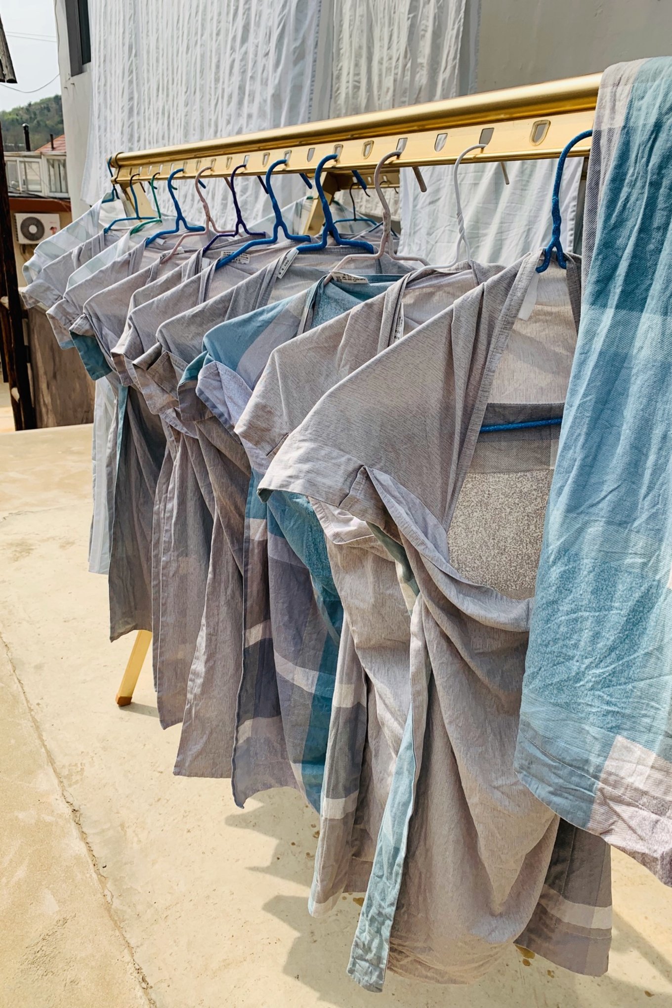 長島海上人家漁家樂每次有客人退房都能看到老板換洗床單被罩,我們是最后一個走的,大批換洗的床單曬在院子里。