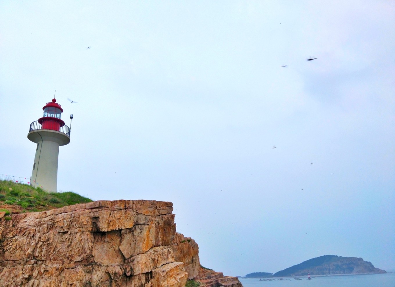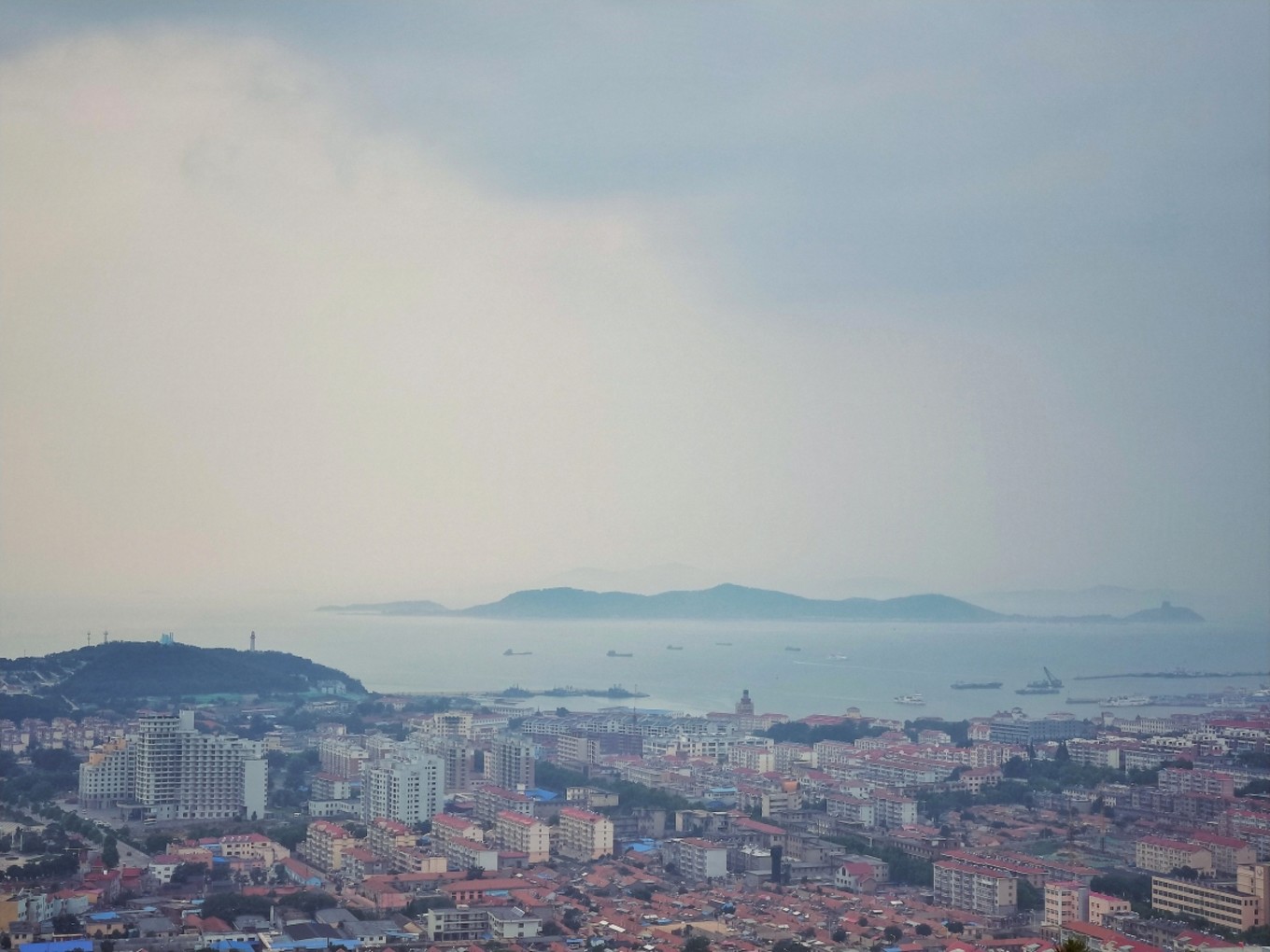 我們下午5:30到達(dá)蓬萊港,加上經(jīng)停,整整12個(gè)小時(shí)!其中有一段長(zhǎng)度200公里的高速,因?yàn)樾蘼?,變成了單車道,?dǎo)致速度慢了不少!還好,趕上了最后一班去往長(zhǎng)島的輪渡。登船時(shí),下起了零星小雨,海面上看起來(lái)霧蒙蒙的,變得更美了…當(dāng)時(shí)還在擔(dān)心,看天氣預(yù)報(bào)接下來(lái)幾天都有雨,感覺會(huì)很掃興,殊不知后來(lái)的幾天曬成狗,每天都盼下雨…