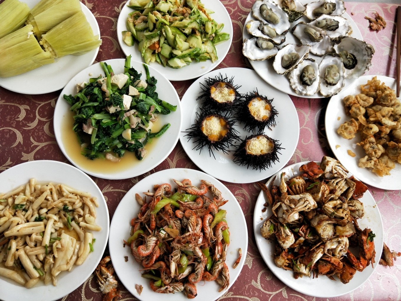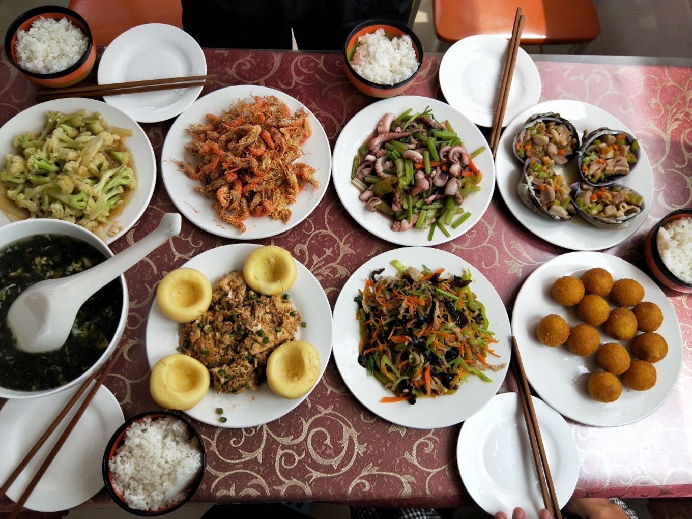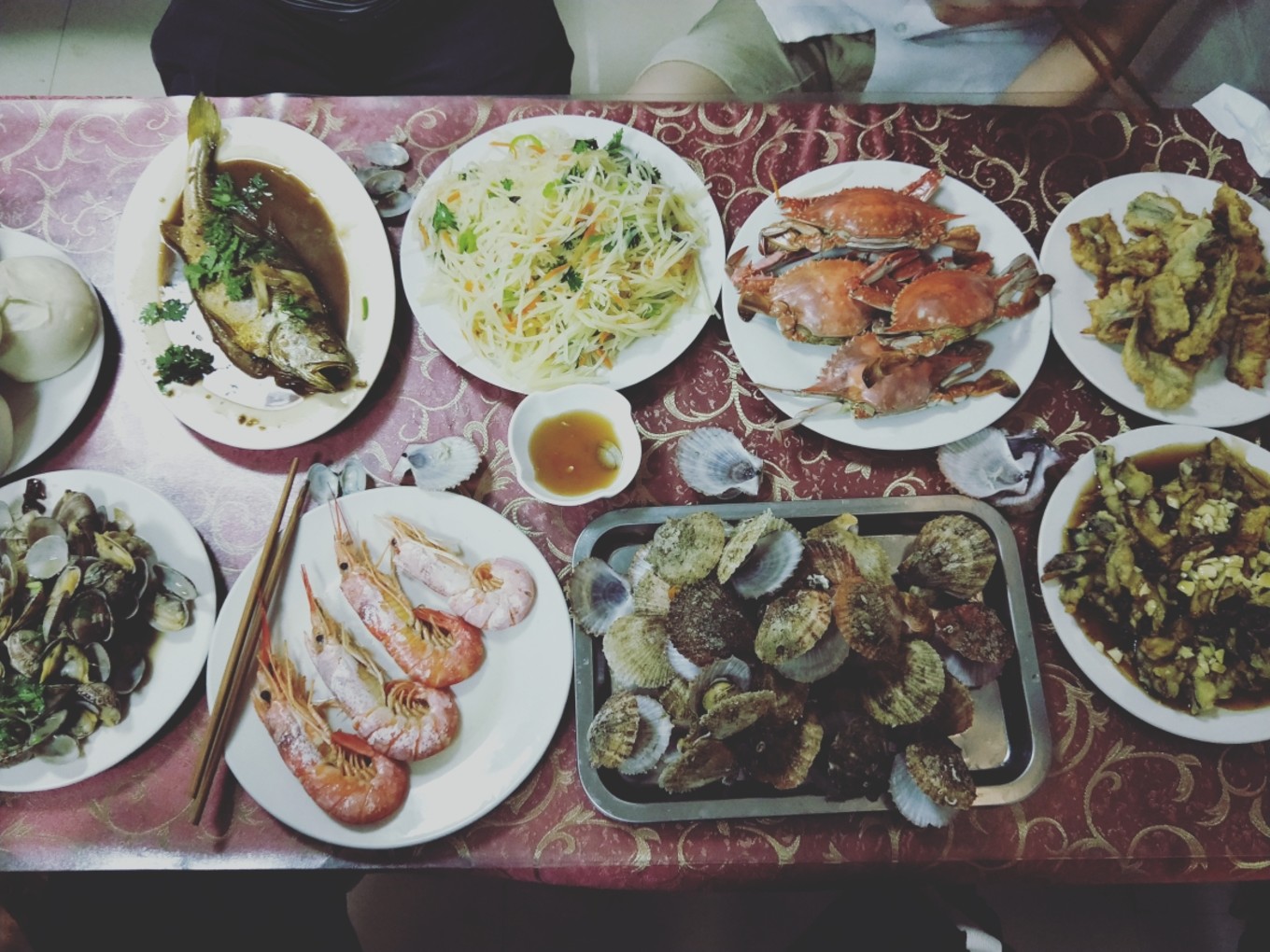 四個(gè)人,八個(gè)菜,蝦還是挺大的!扇貝的肉也很厚實(shí),因?yàn)檫@里的海鮮大部分都是清蒸,所以還是會(huì)有一點(diǎn)腥,剛開始確實(shí)有點(diǎn)吃不習(xí)慣…