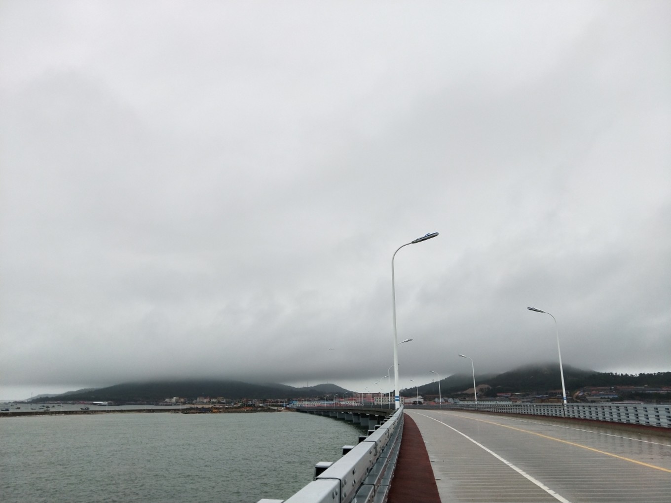 因?yàn)樵绯肯铝它c(diǎn)雨,所有的山頂都被云霧繚繞著,路過跨海大橋,覺得很美,就停下來(lái)拍了幾張。