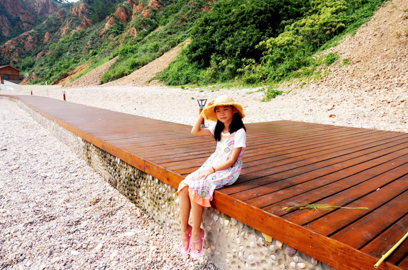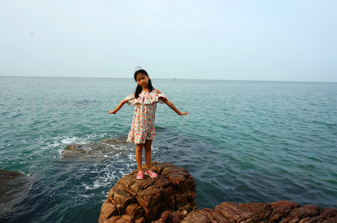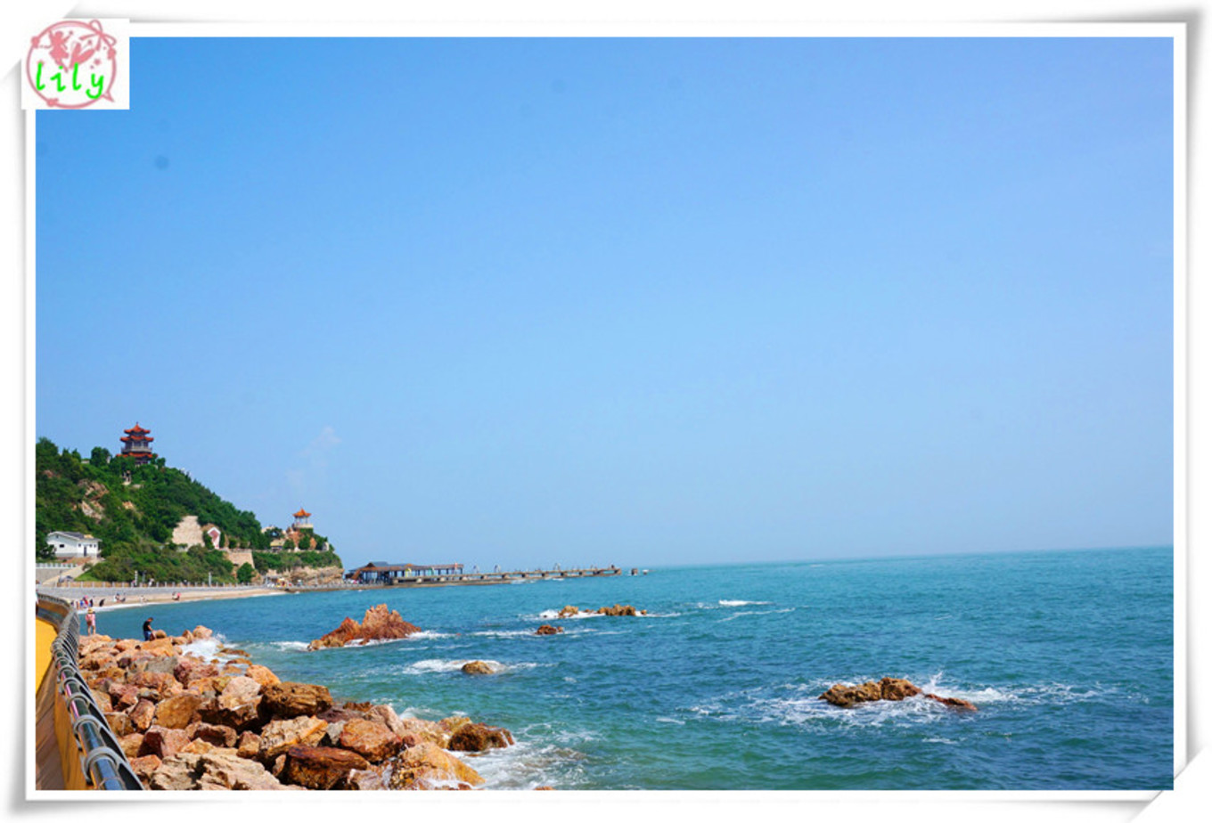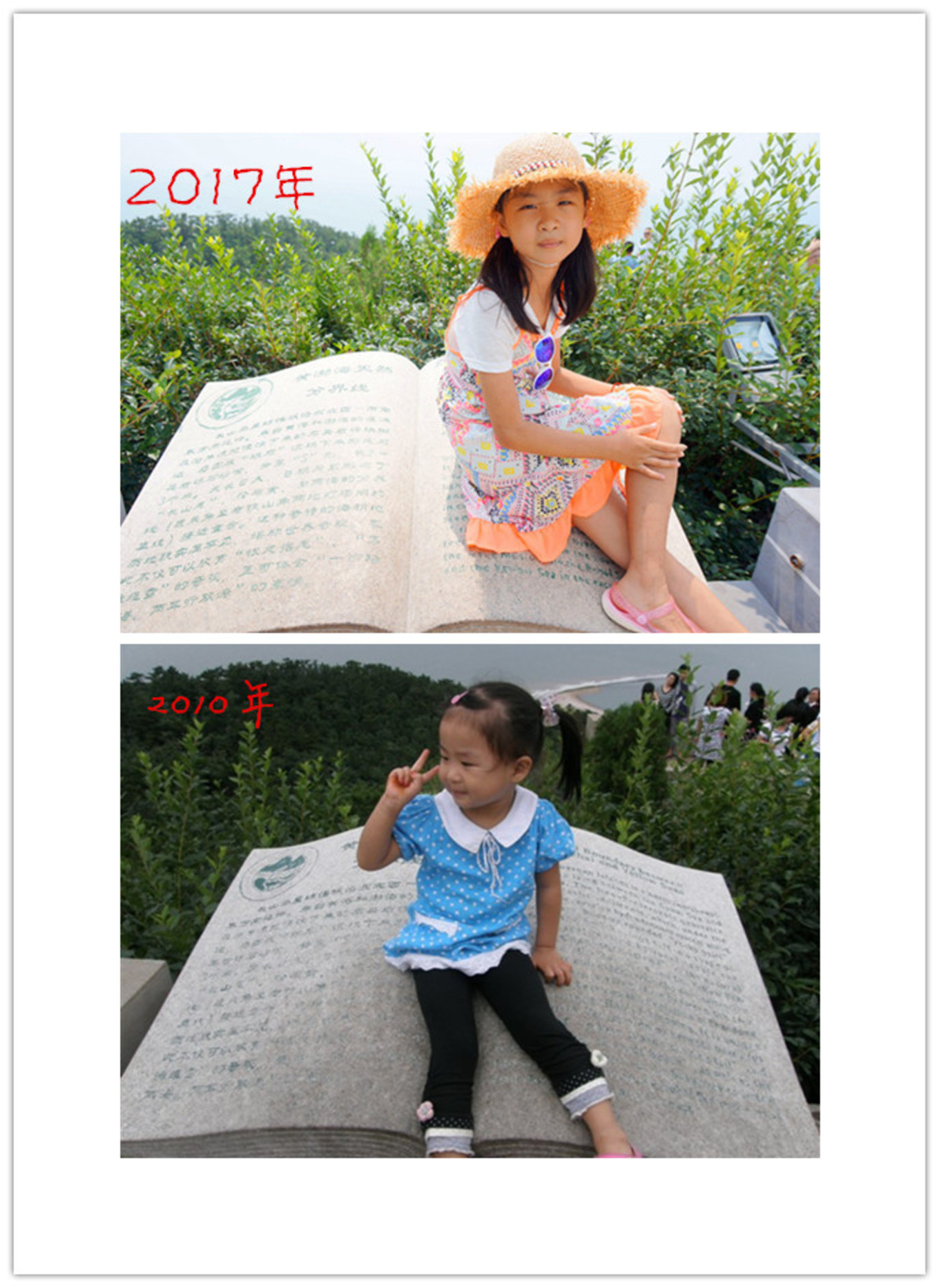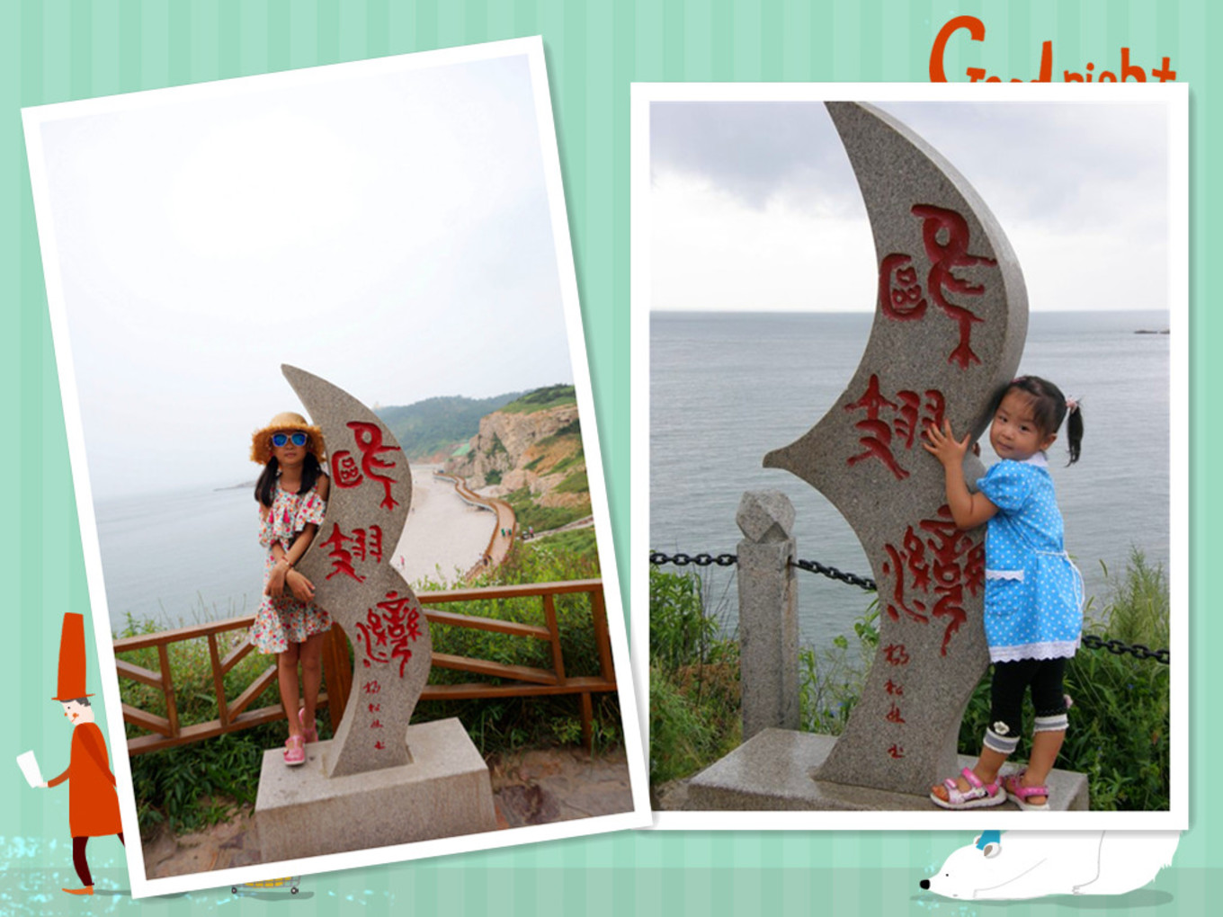 登上黃渤海界碑,七年前你曾在這里留下記憶,七年后的你在同一個(gè)地方再次留下記憶。不變的還是那片海,改變的是你的容顏。從可愛的包仔臉變成小美人。