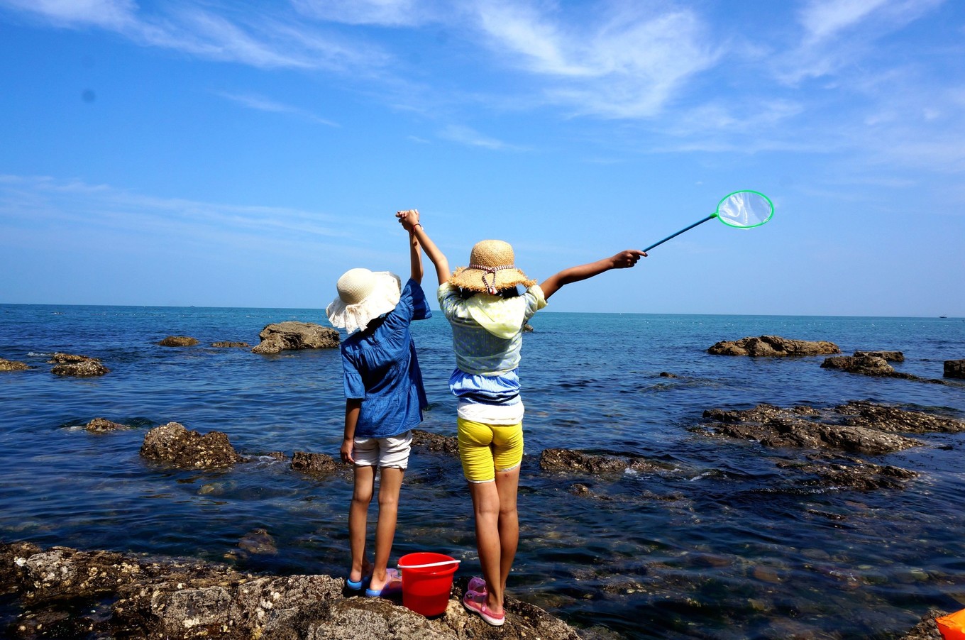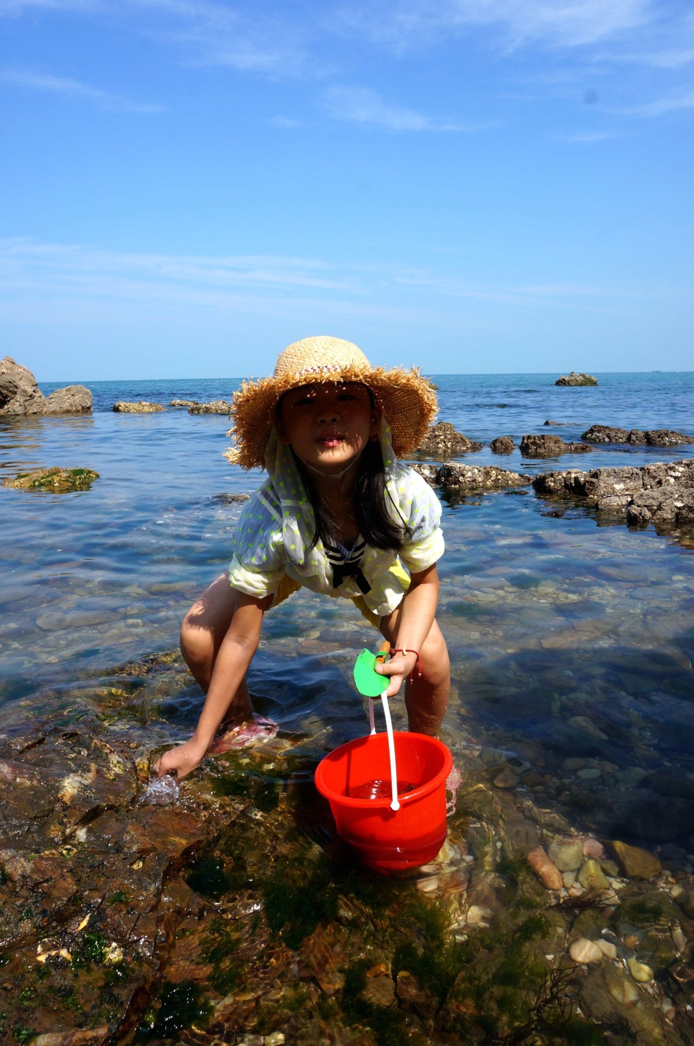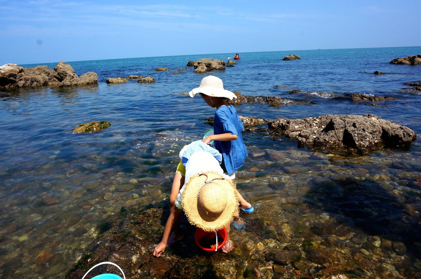 蔚藍(lán)辣眼睛的天空,一望無際,海天一色的大海,孩子們開心撿海鮮,我們安心拍照片。