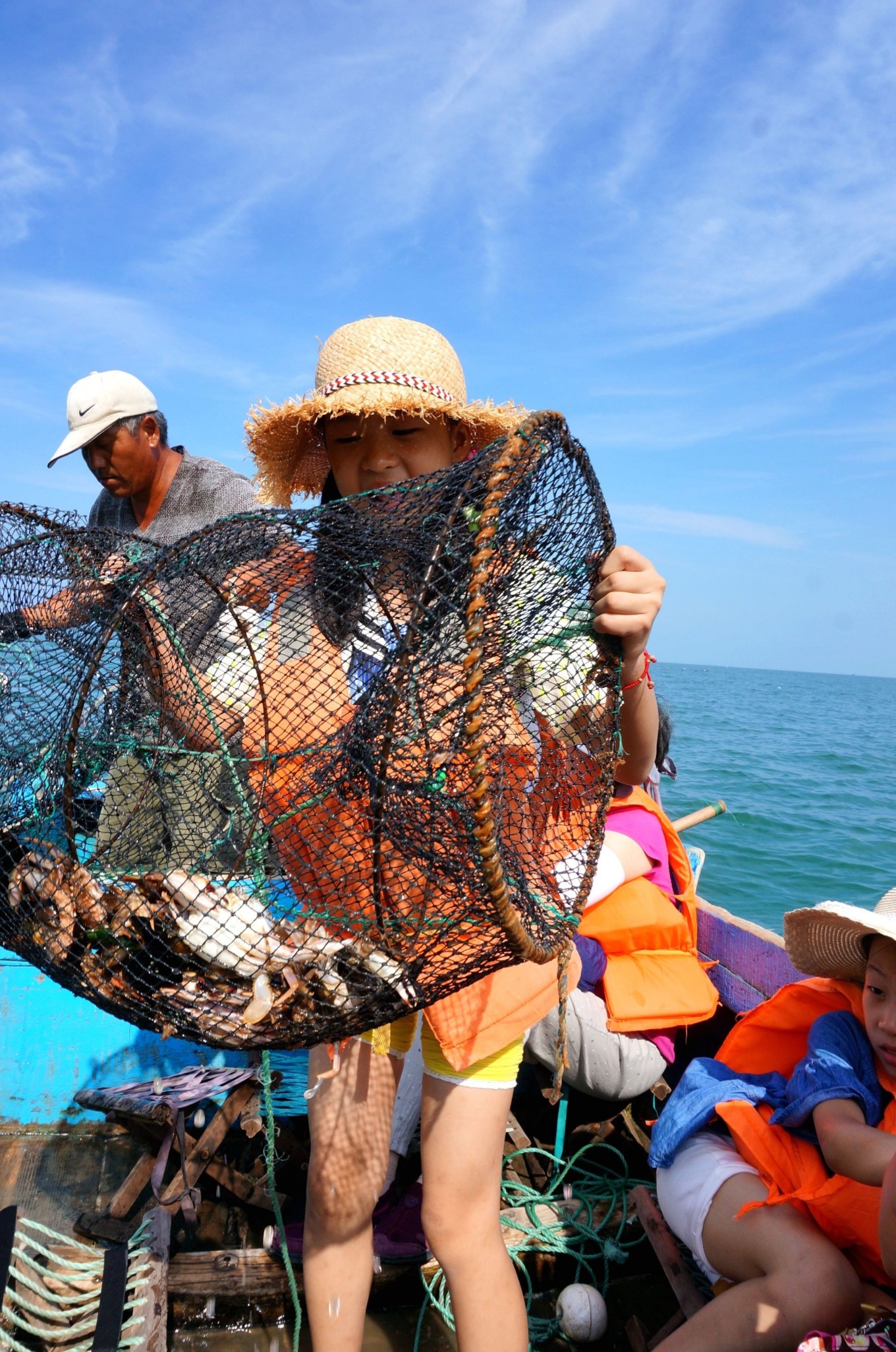 第一次出海拉蟹籠,孩子很興奮。蟹籠里沒啥值錢的東西,抓上來的梭子蟹好小一點(diǎn)點(diǎn),我們又把它放回海里了,留下一些扇貝和海虹。
