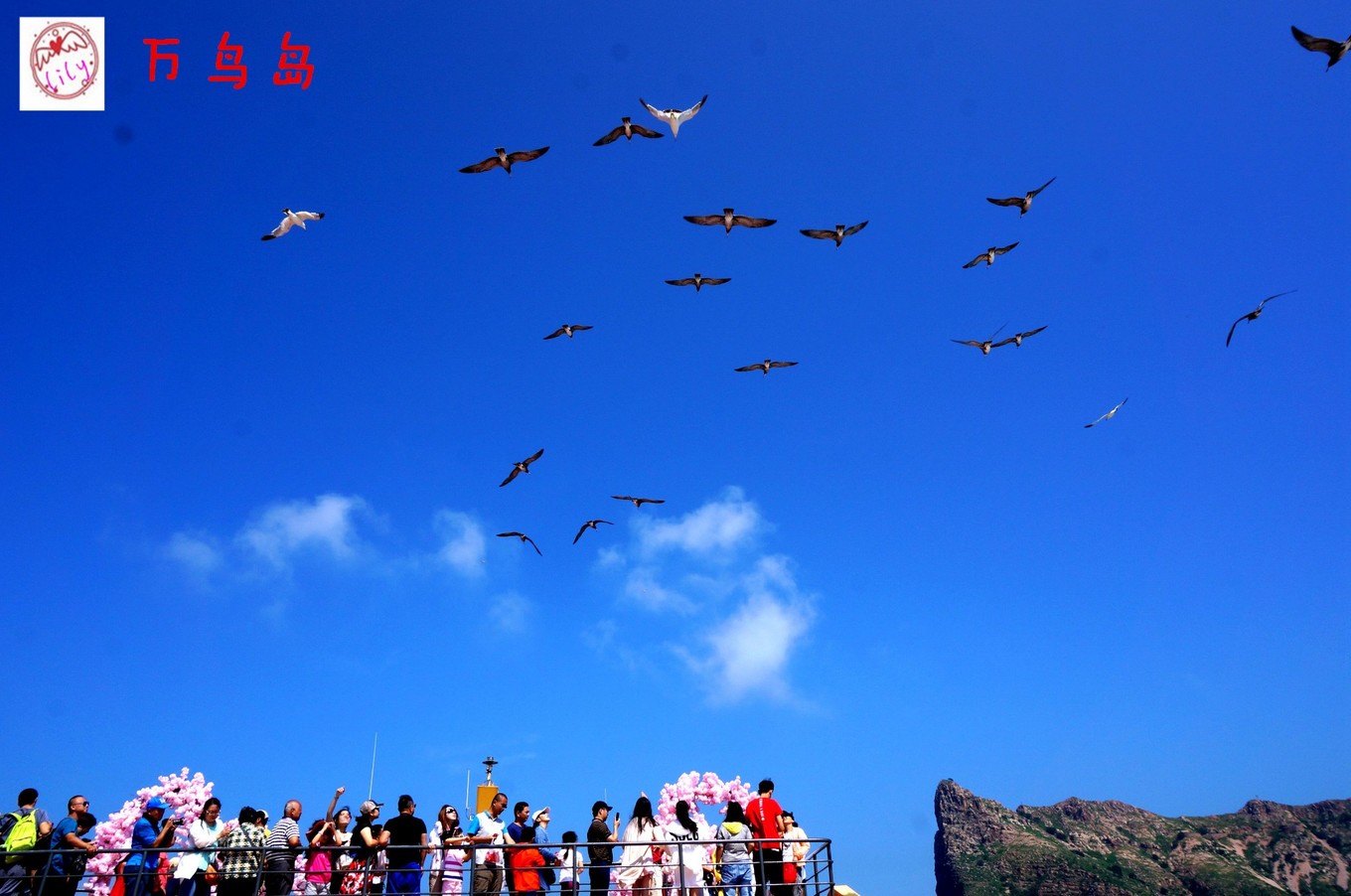 在甲板上也聽不見廣播,也不知道有沒有到萬鳥島,反正看到一些海鷗,人們都圍到甲板上開始喂海鷗,因?yàn)閿?shù)量不多,沒有領(lǐng)略到海鷗飛下來吃食的風(fēng)光,海鷗只在頭領(lǐng)盤旋,鳴叫,我們把火腿腸掰小塊,用力向天上拋,海鷗居然可以接到,太厲害了。