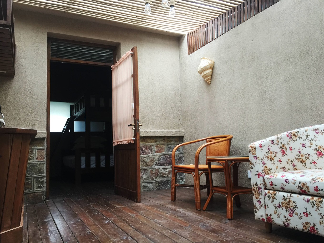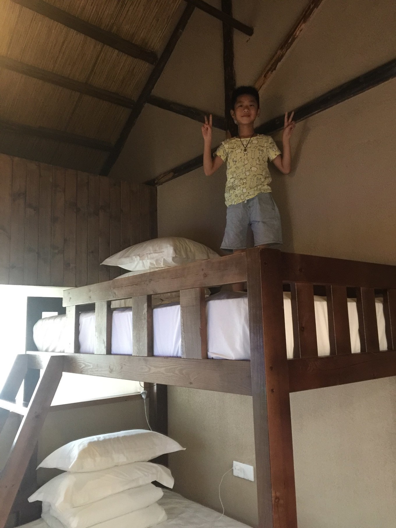 度假村里的房間是這種獨(dú)立門戶的房間,我很喜歡。我們訂的是一間親子房,一進(jìn)門有一個小客廳,里面是臥室,有一張上下鋪的床,兒子第一次睡這種床,各種興奮!
