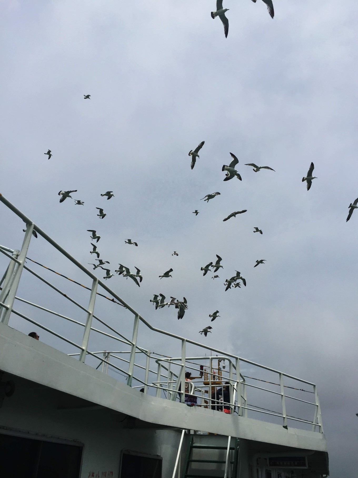 長島回蓬萊的客輪上,花了30元升到VIP艙(大人20元,小孩10元。這個價格看船上人員的心情,一般要價20元/人)。需要自行準(zhǔn)備火腿腸喂海鷗,或者在船上買。記住,已經(jīng)不允許喂方便面了,因為發(fā)生過海鷗被脹死的事件。